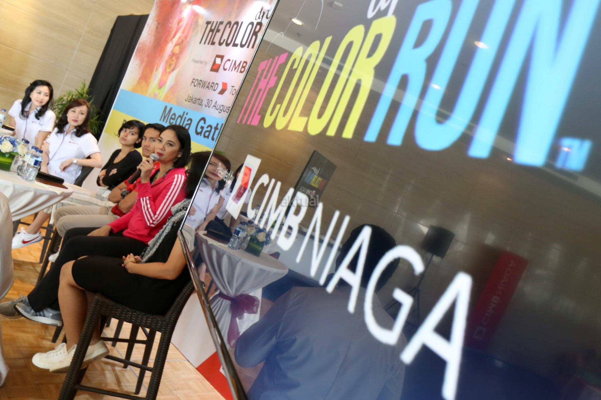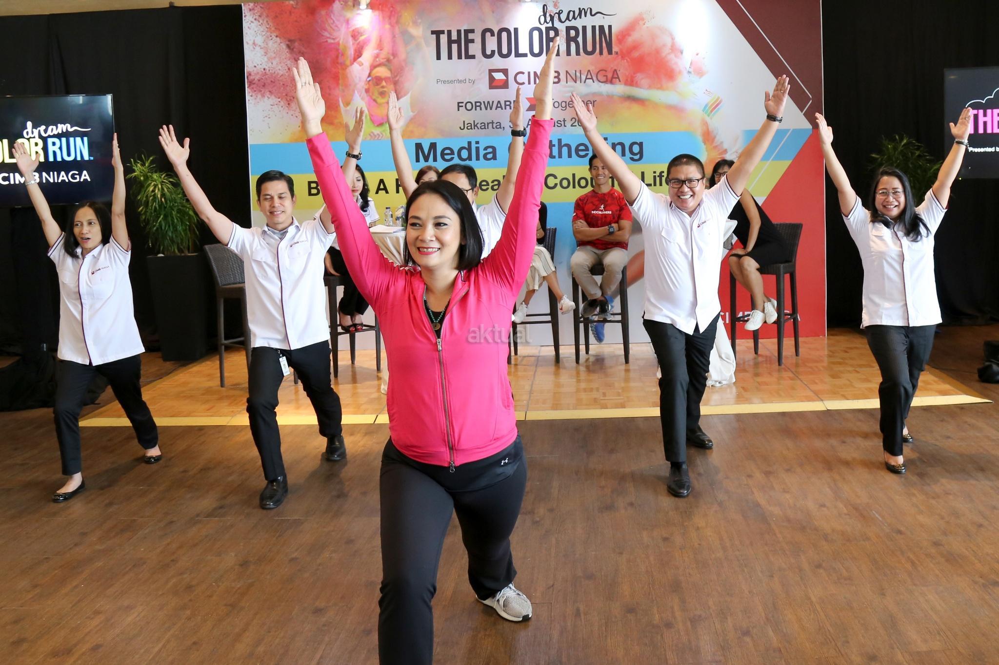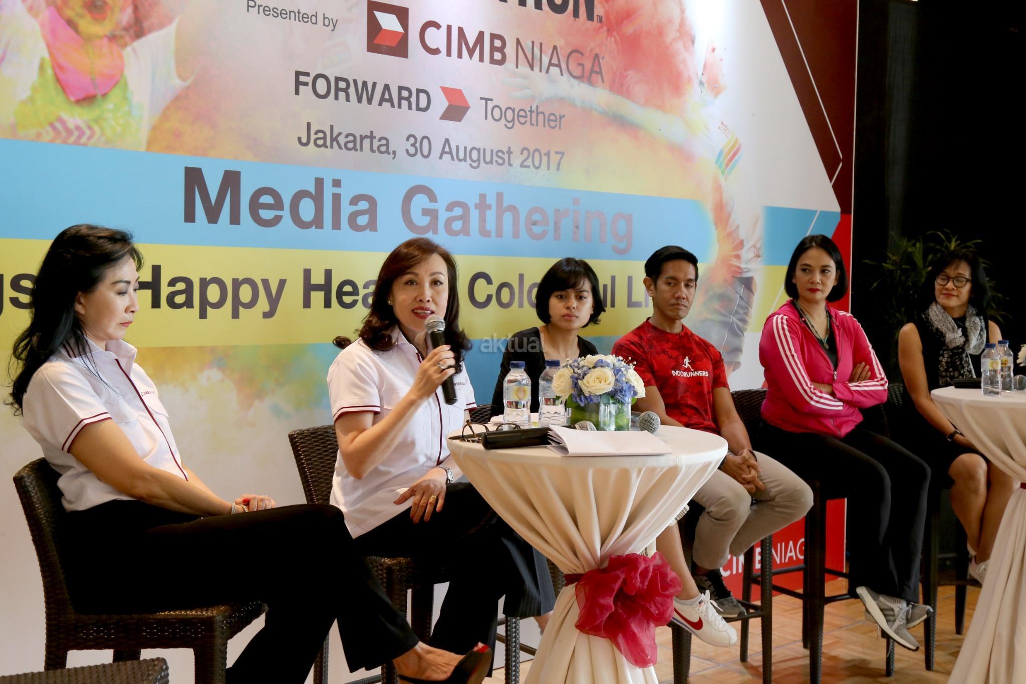 Direktur Consumer Banking CIMB Niaga Lani Darmawan (kedua kiri) bersama Direktur Compliance, Corporate Secretary & Legal CIMB Niaga Fransiska Oey (kiri) dan Artis Eva Celia (ketiga kiri), Founder of Indorunner Reza Puspo (ketiga kanan), Artis Dian Nitami (kedua kanan) dan Founder of Welldressed Sutji Sosrowardojo saat media gathering dan sosialisasi "The Color Run 2017 Dream World Tour" di Glass House, Ritz Carlton, Jakarta, Rabu (30/8). PT Bank CIMB Niaga Tbk mengajak semua pelari warna untuk menerapkan gaya hidup sehat serta membawa kebahagiaan, kesehatan, dan penuh warna dalam kehidupan sehari-hari untuk keempat kalinya menggelar The Color Run pada awal Oktober mendatang di kawasan Gelora Bung Karno Jakarta. Peserta The Color Run yang akan menempuh trek sepanjang 5 km ini selain dimanjakan dengan hadirnya food trucks, fun zone, dan photobooth juga diajak untuk berbagi kebahagiaan dengan para penyandang khusus dari Yayasan Pembinaan Anak Cacat (YPAC) Nasional. AKTUAL/Tino Oktaviano