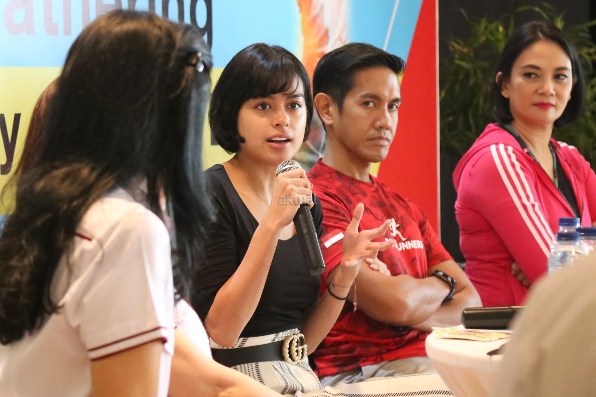 Artis Eva Celia saat media gathering dan sosialisasi “The Color Run 2017 Dream World Tour” di Glass House, Ritz Carlton, Jakarta, Rabu (30/8). PT Bank CIMB Niaga Tbk mengajak semua pelari warna untuk menerapkan gaya hidup sehat serta membawa kebahagiaan, kesehatan, dan penuh warna dalam kehidupan sehari-hari untuk keempat kalinya menggelar The Color Run pada awal Oktober mendatang di kawasan Gelora Bung Karno Jakarta. Peserta The Color Run yang akan menempuh trek sepanjang 5 km ini selain dimanjakan dengan hadirnya food trucks, fun zone, dan photobooth juga diajak untuk berbagi kebahagiaan dengan para penyandang khusus dari Yayasan Pembinaan Anak Cacat (YPAC) Nasional. AKTUAL/Tino Oktaviano