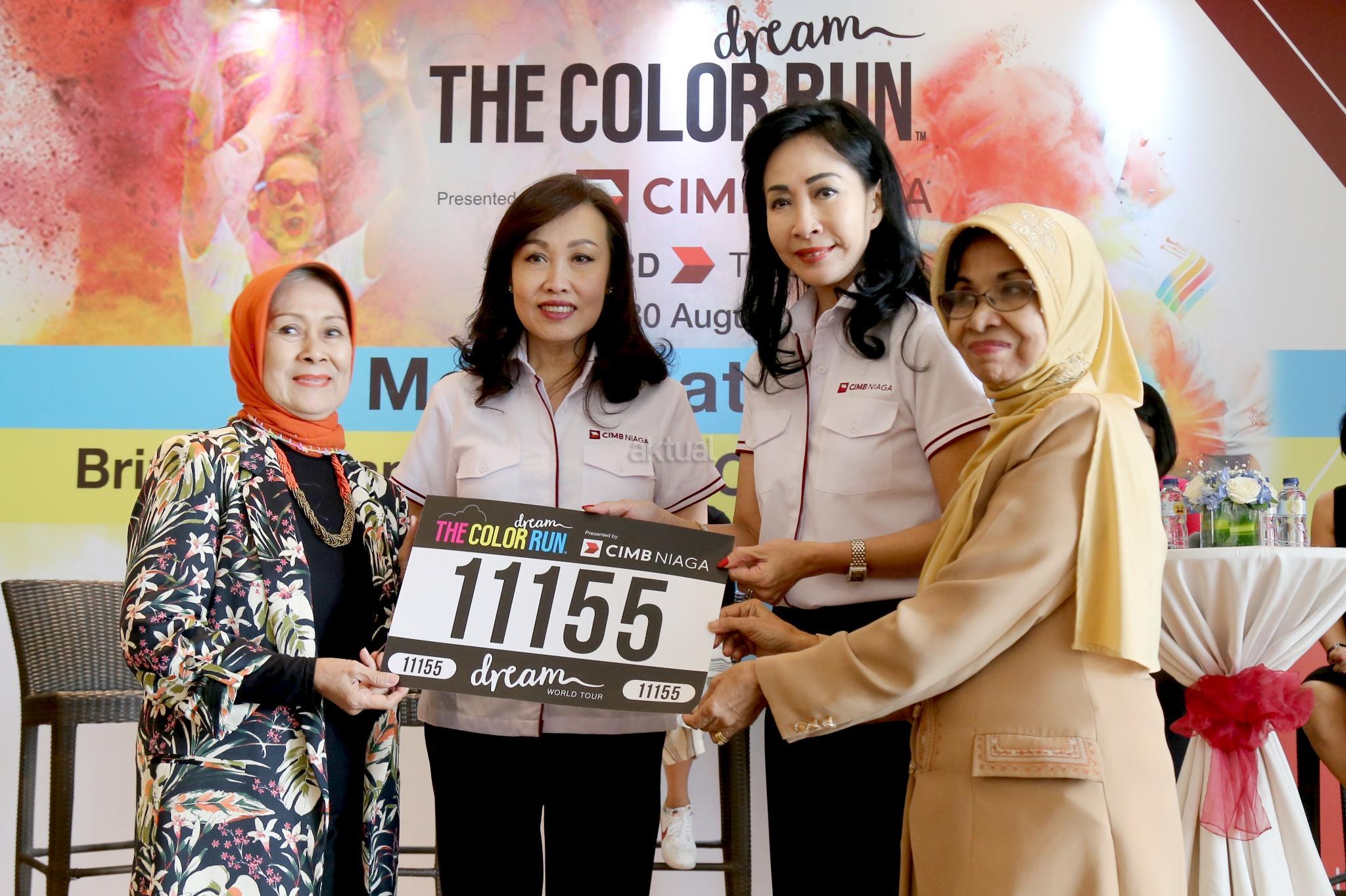 Direktur Consumer Banking CIMB Niaga Lani Darmawan (kedua kiri) bersama Direktur Compliance, Corporate Secretary & Legal CIMB Niaga Fransiska Oey (kedua kanan) menyerahkan secara simbolis nomor kepada Perwakilan Yayasan Pembinaan Anak Cacat (YPAC) Nasional saat media gathering dan sosialisasi “The Color Run 2017 Dream World Tour” di Glass House, Ritz Carlton, Jakarta, Rabu (30/8). Tahun ini CIMB Niaga mengangkat tema untuk Color Run ini adalah “The Color Run 2017 Dream World Tour” dengan tujuan yang ingin dicapai CIMB Niaga yakni menawarkan berbagai solusi kepada nasabahnya untuk membantu mempercepat pencapaian ambisi, tujuan, dan impian mereka dalam setiap tahap kehidupan. AKTUAL/Tino Oktaviano