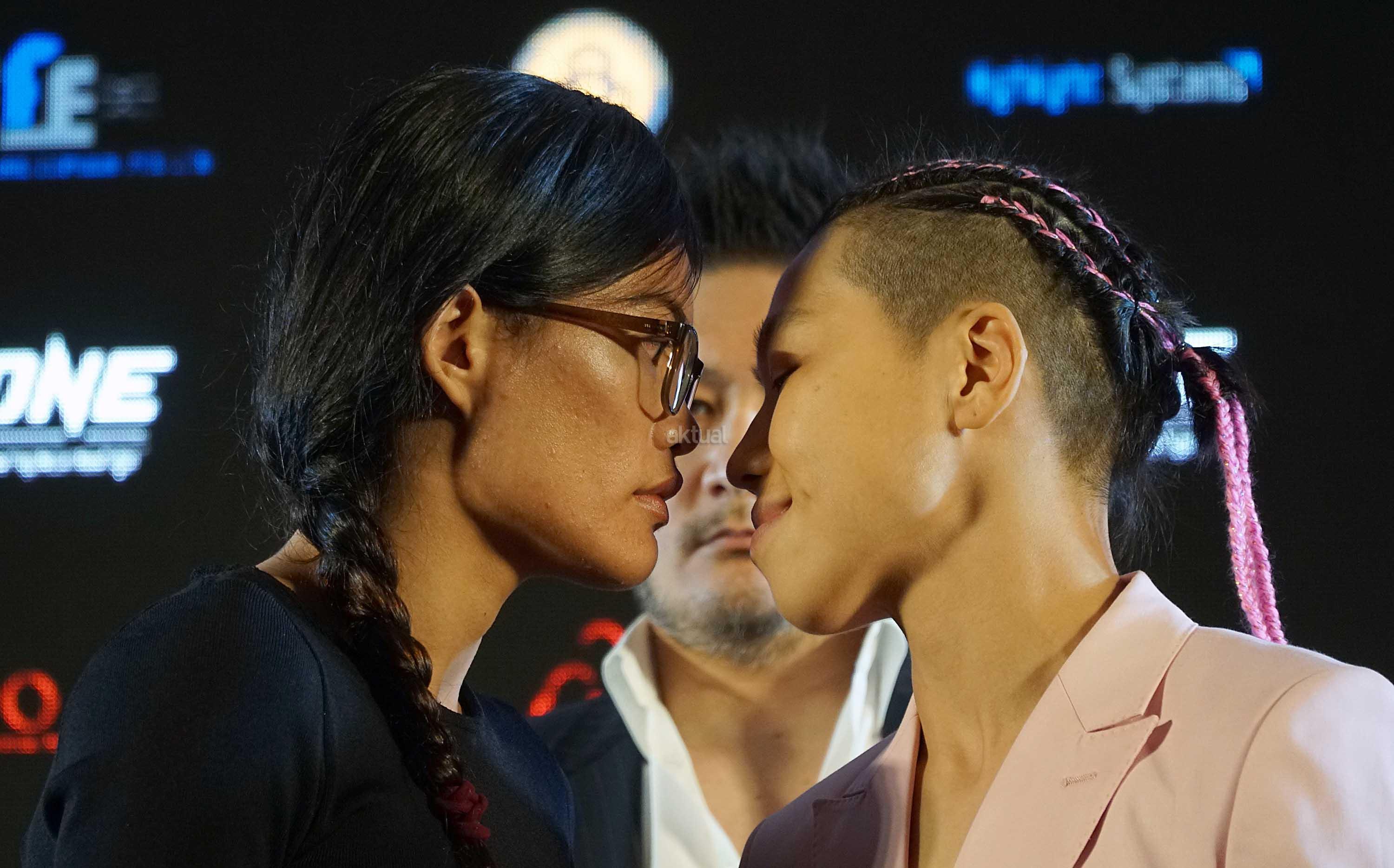 Petarung utama Tiffany “No Chill” Teo dari Singapore (kiri) dan ” The Panda” Xiong Jiang Nan dari China disaksikan CEO& Chairman ONE Championship, Chatri Sityodtong saling bertatapan mata seusai jumpa pers di Fairmont Hotel, Jakarta, Kamis (18/1). ONE Championship adalah properti media olahraga terbesar dalam sejarah Asia. berkantor pusat di Singapura, organisasi seni bela diri campuran yang paling menarik di dunia ini menjadi tuan rumah acara olahraga hiburan terbesar di seluruh Asia dengan menampilkan para atlet beladiri campuran terbaik di Asia dan para juara dunia. AKTUAL/Eko S Hilman