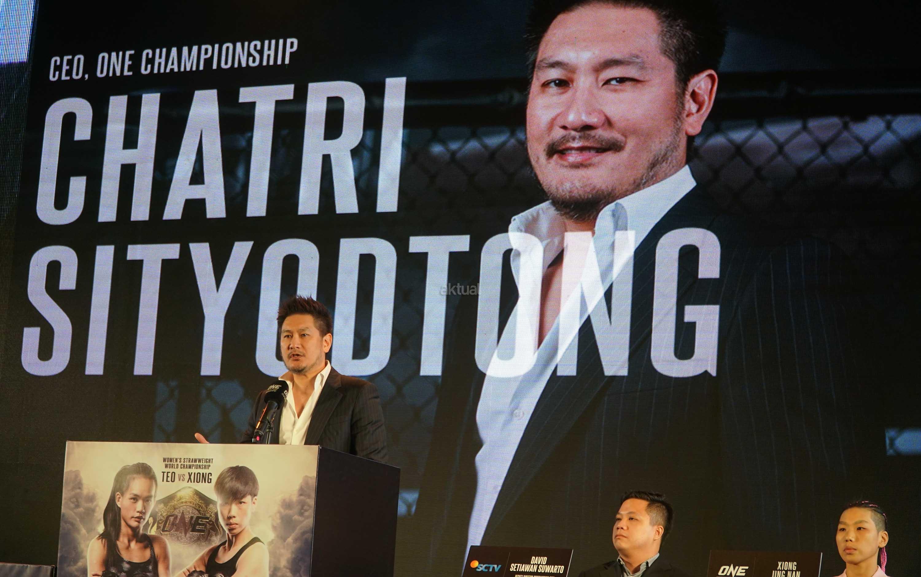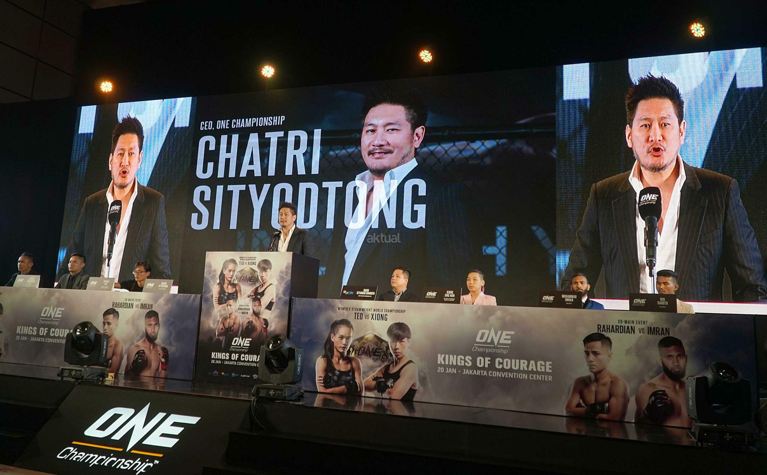 CEO& Chairman ONE Championship, Chatri Sityodtong saat menyampaikan program gelaran ONE Kings Of Courage saat jumpa pers di Fairmont Hotel, Jakarta, Kamis (18/1). Gelaran yang akan diadakan di Jakarta Convention Centre pada 20 Januari mendatang akan menampilkan dua petarung utama Tiffany "No Chill" Teo dari Singapore dan " The Panda" Xiong Jiang Nan dari China serta Dua petarung laga pendukung Stefer Rahardian dari Indonesia dan Muhammad Imran dari Pakistan serta tak ketinggalan "The Terminator" Sunoto yang akan menantang Rin saroth dari Cambodia. ONE Championship adalah properti media olahraga terbesar dalam sejarah Asia. berkantor pusat di Singapura, organisasi seni bela diri campuran yang paling menarik di dunia ini menjadi tuan rumah acara olahraga hiburan terbesar di seluruh Asia dengan menampilkan para atlet beladiri campuran terbaik di Asia dan para juara dunia. AKTUAL/Eko S Hilman