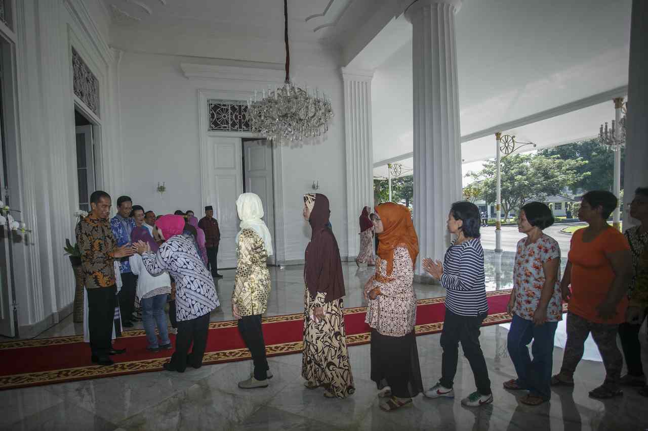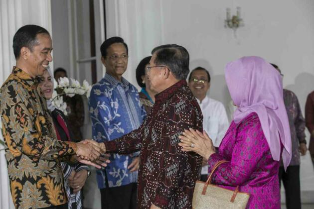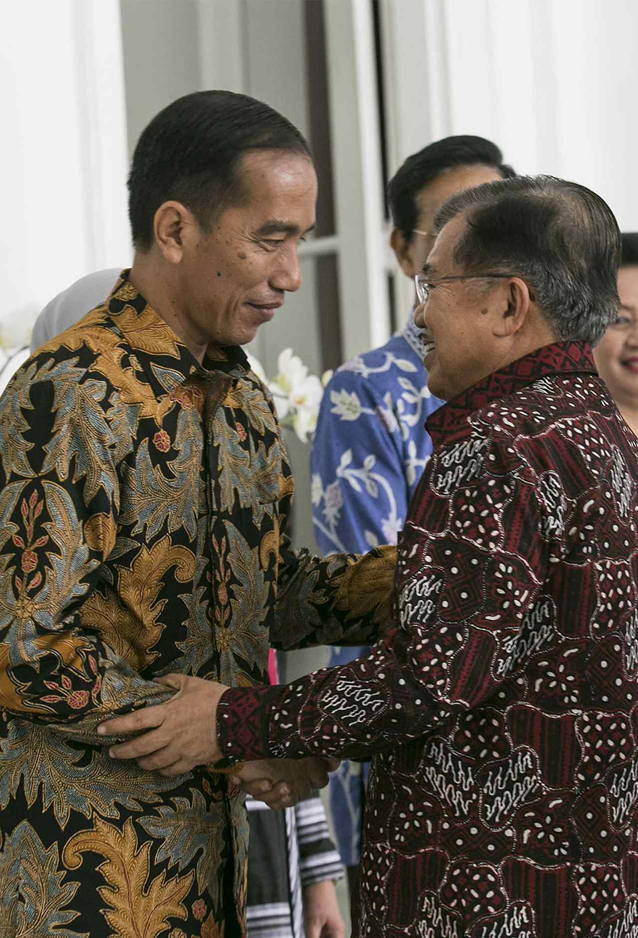 Presiden Joko Widodo (kiri) bersalaman dengan Wakil Presiden Jusuf Kalla (tengah) saat acara open house Idul Fitri 1437 H di Istana Kepresidenan, Yogyakarta, Sabtu (9/7). Presiden Jokowi bertemu dengan Wakli Presiden Jusuf Kalla untuk merayakan Idulfitri 1437 H bersama warga Yogyakarta di Istana Kepresidenan. ANTARA FOTO/Hendra Nurdiyansyah/16