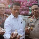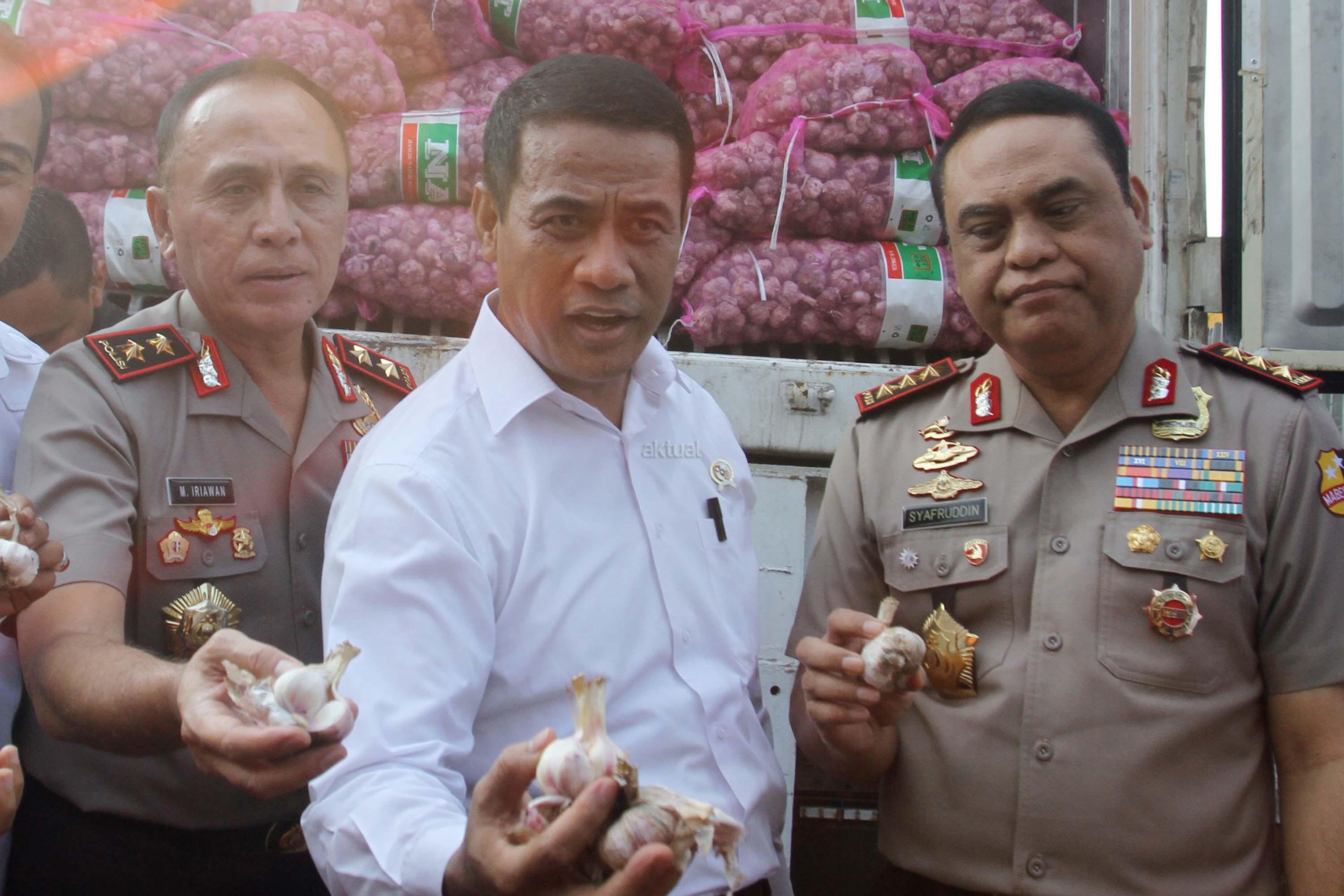 Menteri Pertanian, Amran (dua kanan) didampingi Wakapolri Komjen Syafruddin (kiri), Kapolda Metro Jaya Irjen Pol M Iriawan (dua kiri), menunjukan bawang putih saat menggelar operasi pasar di Pasar Induk Kramat Jati, Jakarta, Rabu (17/5/2017). 2 kontainer bawang putih yang diimpor langsung dari China berisi 29 ton ini bertujuan untuk menekan harga bawang putih yang sedang melambung. AKTUAL/Munzir
