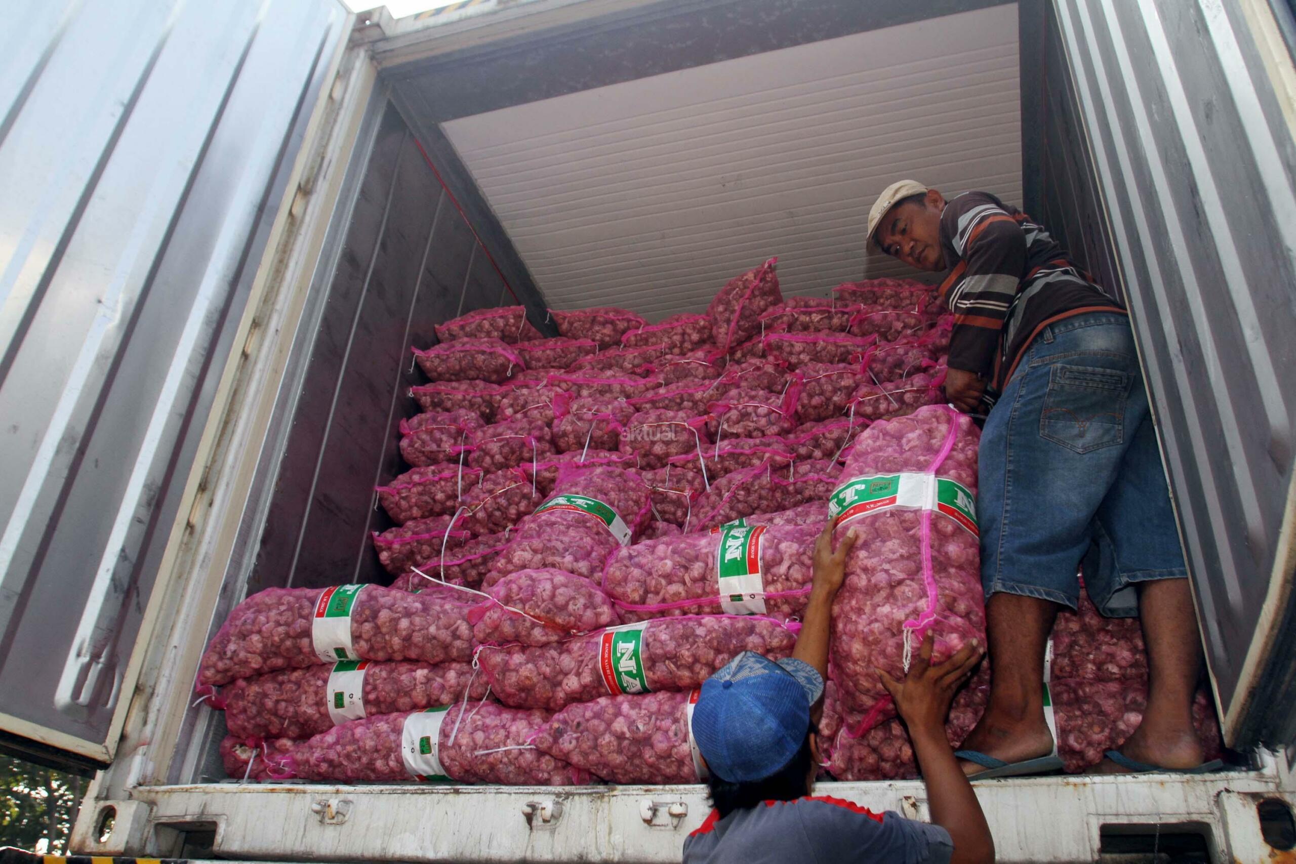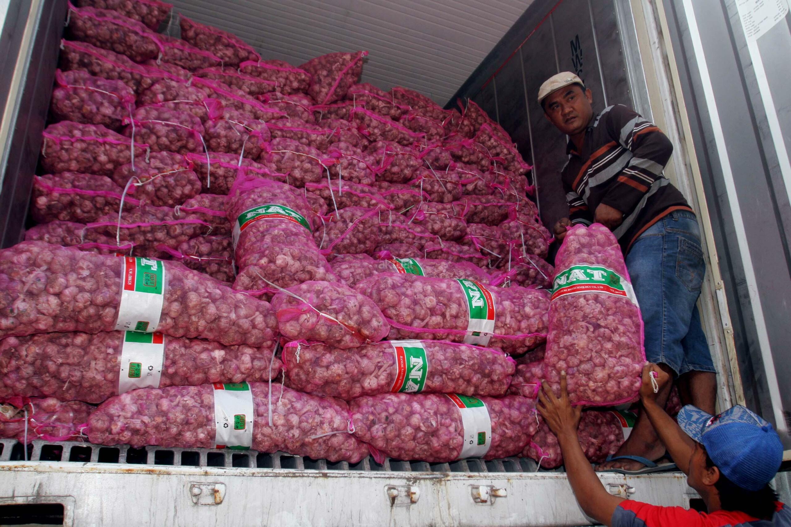 Bawang putih sebelum diturunkan dari kontainer saat operasi pasar di Pasar Induk Kramat Jati, Jakarta, Rabu (17/5/2017). 2 kontainer bawang putih yang diimpor langsung dari China berisi 29 ton ini bertujuan untuk menekan harga bawang putih yang sedang melambung.