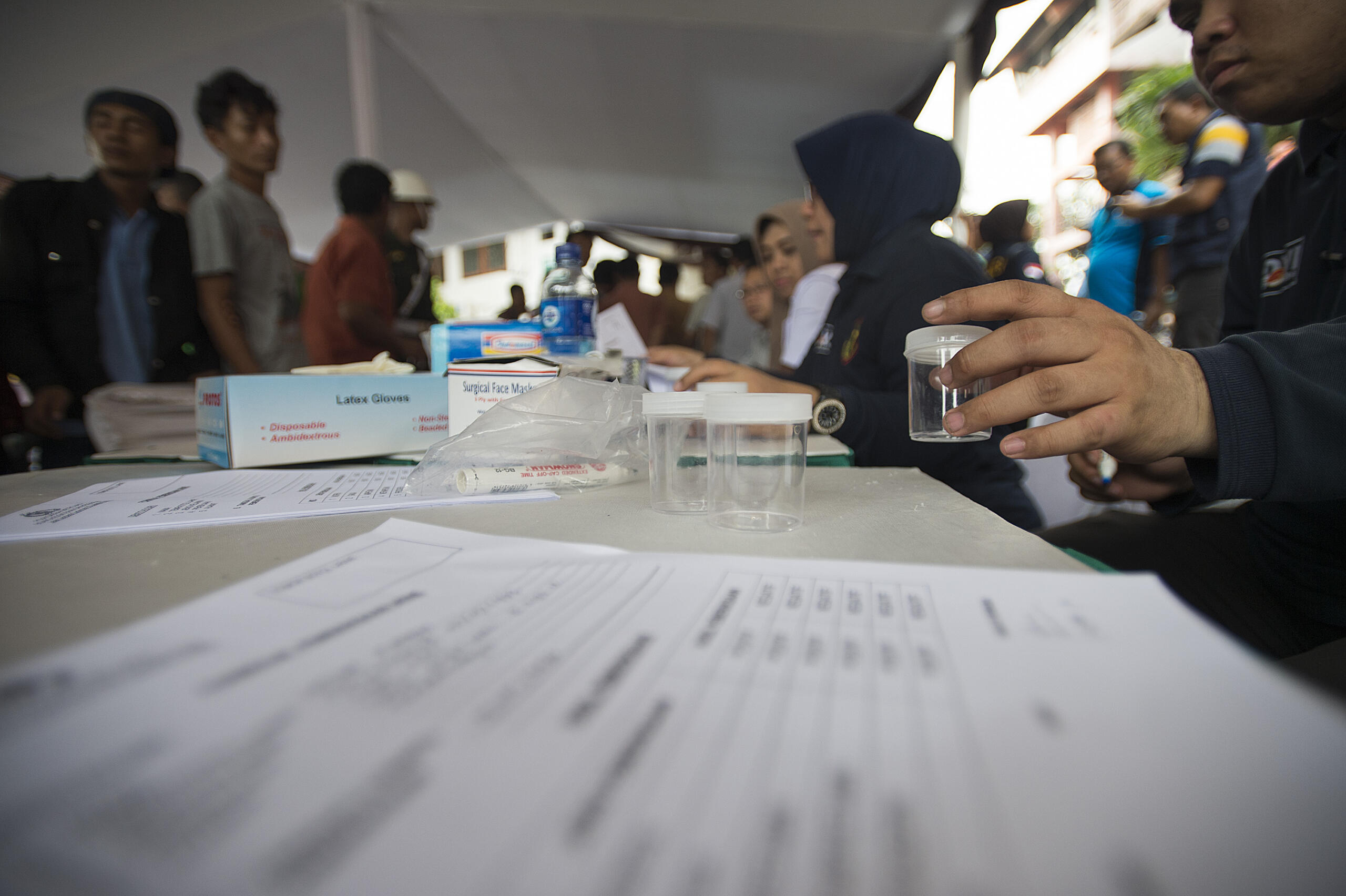 Petugas gabungan dari Biddokkes Polda Metro Jaya dan Badan Narkotika Nasional melakukan tes urine terhadap sejumlah orang ketika menggelar Operasi Pekat Jaya 2016 di Terminal Kampung Rambutan, Jakarta, Kamis (19/5). Operasi Pekat Jaya 2016 menjelang bulan Ramadan di terminal bus tersebut menyasar awak bus yang terdiri dari sopir dan kernet serta orang atau penumpang yang dicurigai membawa atau menggunakan narkoba. ANTARA FOTO/Widodo S. Jusuf/aww/16.