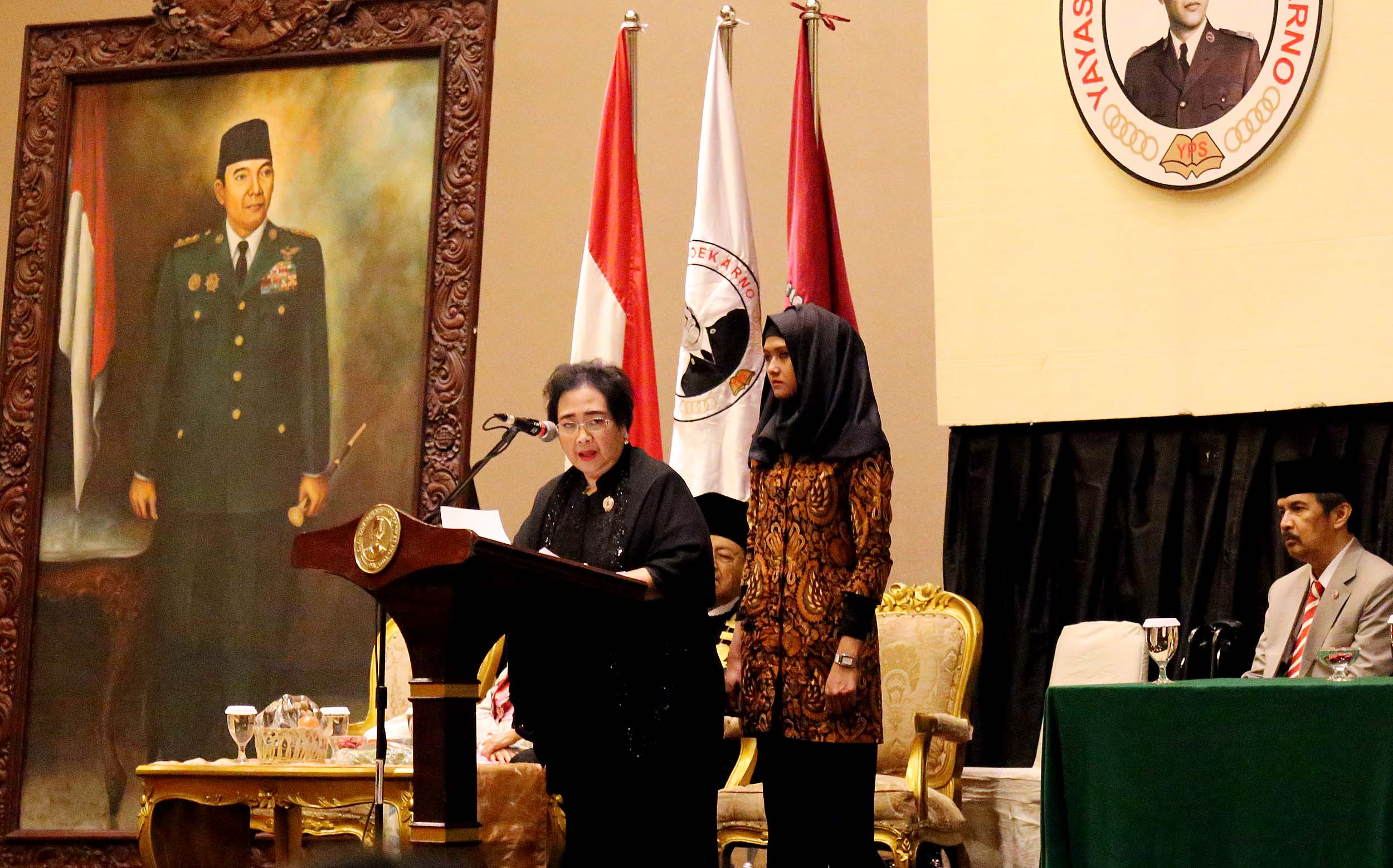 Ketua Pendiri Yayasan Bung Karno Rachmawati Soekarnoputri saat memberikan pidato sambutannya dalam acara Dies Natalis ke – 17 Universitas Bung Karno di di Jakarta, Senin (25/7/2016). Mahathir Mohamad menyampaikan orasi ilmiah dengan tema Membangun Kemandirian Ekonomi dan Pemerintahan Bersih dalam rangka Dies Natalis ke-17 Universitas Bung Karno (UBK).