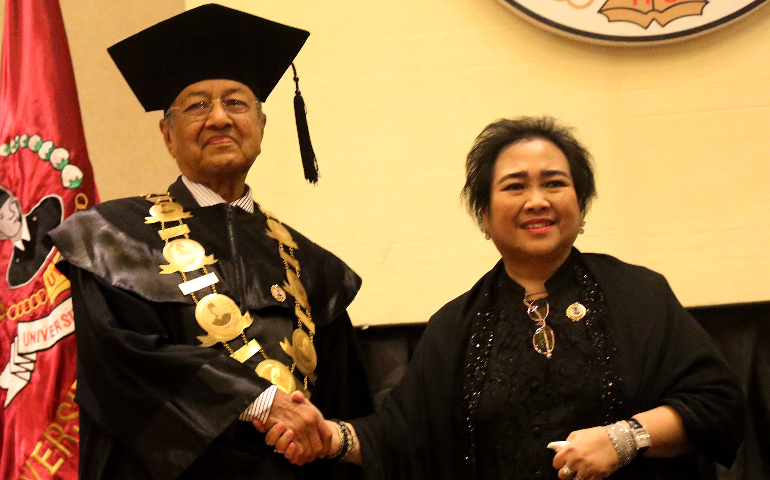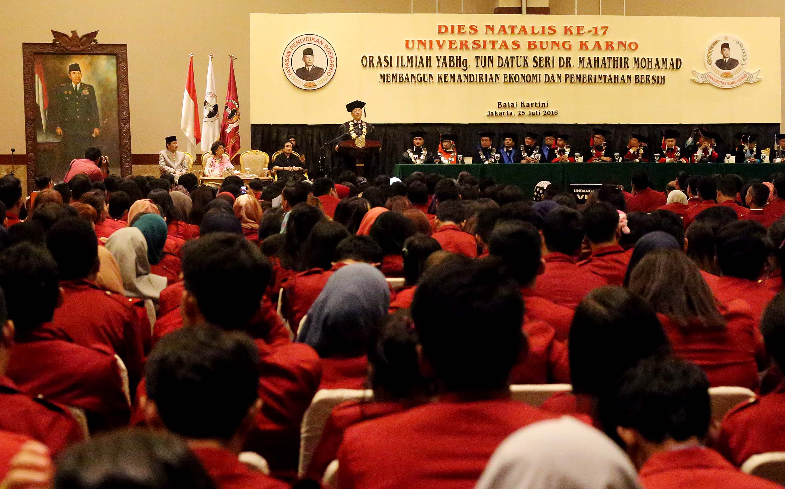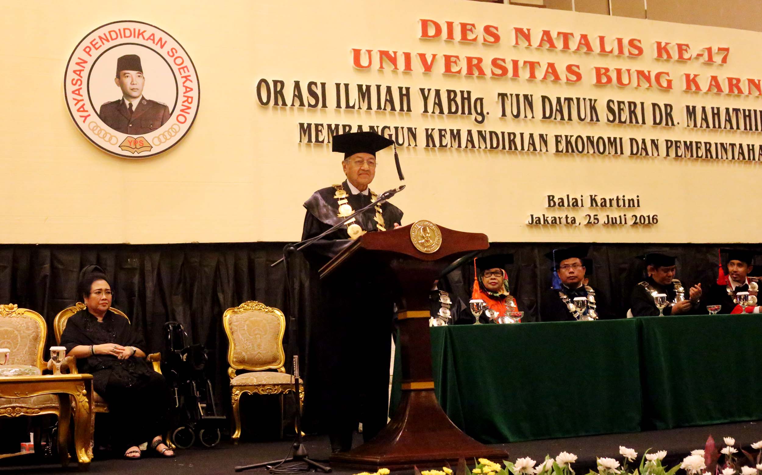 Ketua Pendiri Yayasan Bung Karno Rachmawati Soekarnoputri bersama Mantan Perdana Menteri Malaysia Mahathir Mohamad mengahadiri acara Dies Natalis Universitas Bung Karno (UBK) ke – 17 di Jakarta, Senin (25/7/2016). Mahathir Mohamad menyampaikan orasi ilmiah dengan tema Membangun Kemandirian Ekonomi dan Pemerintahan Bersih dalam rangka Dies Natalis ke-17 Universitas Bung Karno (UBK).