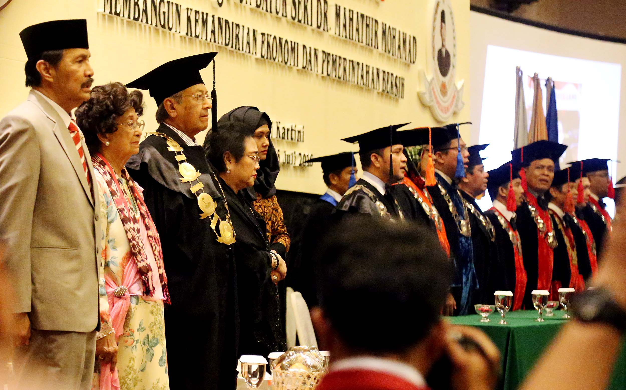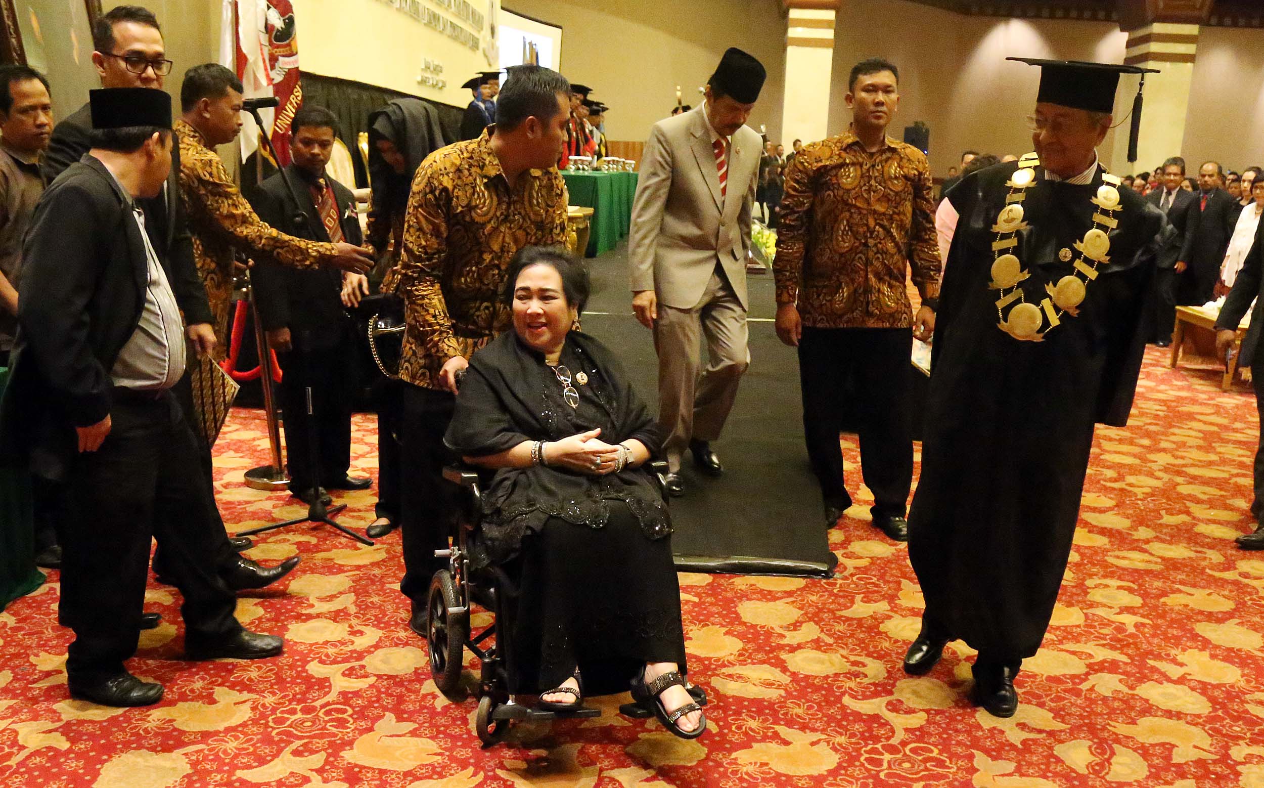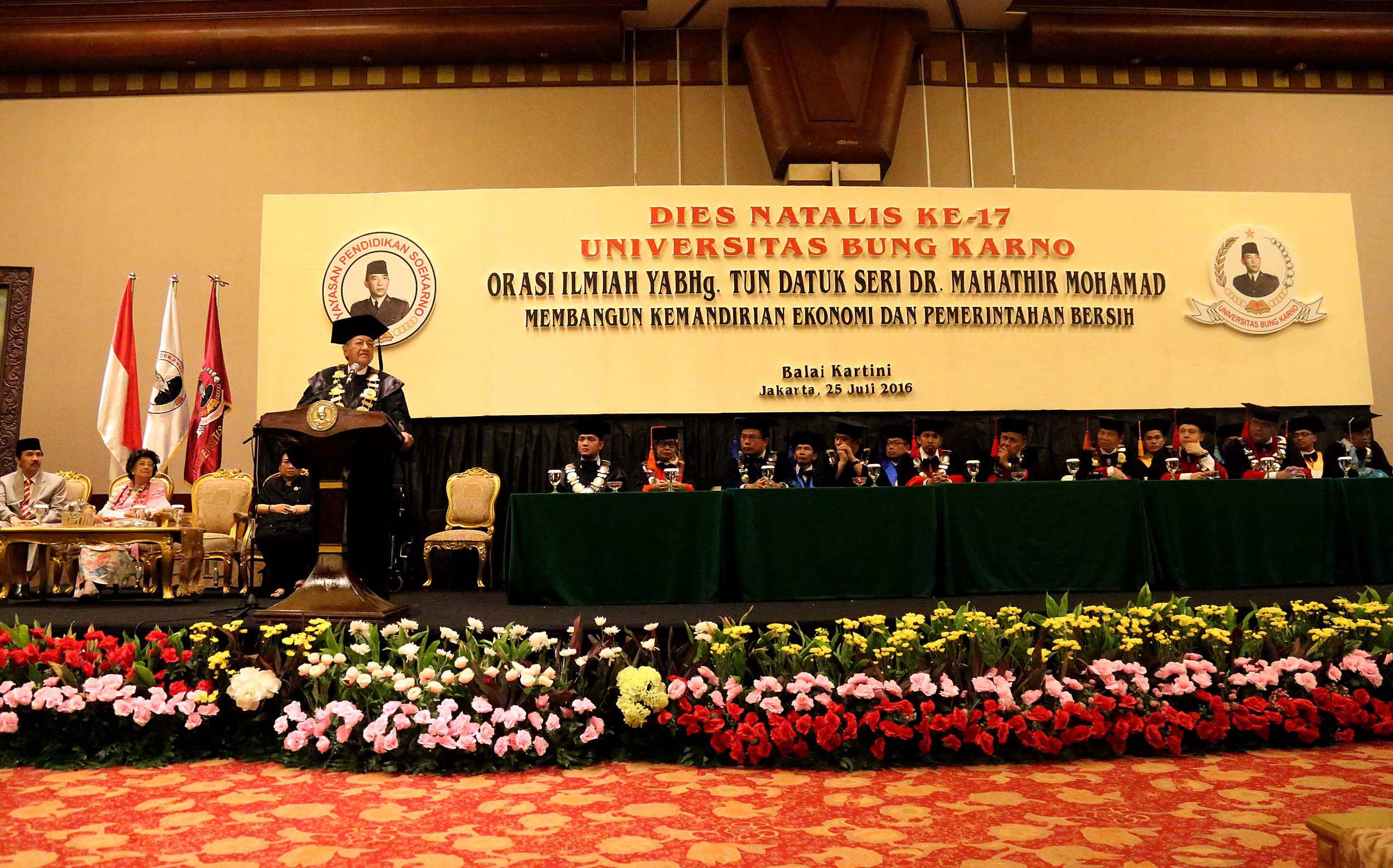 Ketua Pendiri Yayasan Bung Karno Rachmawati Soekarnoputri bersama Mantan Perdana Menteri Malaysia Mahathir Mohamad mengahadiri acara Dies Natalis Universitas Bung Karno (UBK) ke – 17 di Jakarta, Senin (25/7/2016). Mahathir Mohamad menyampaikan orasi ilmiah dengan tema Membangun Kemandirian Ekonomi dan Pemerintahan Bersih dalam rangka Dies Natalis ke-17 Universitas Bung Karno (UBK).