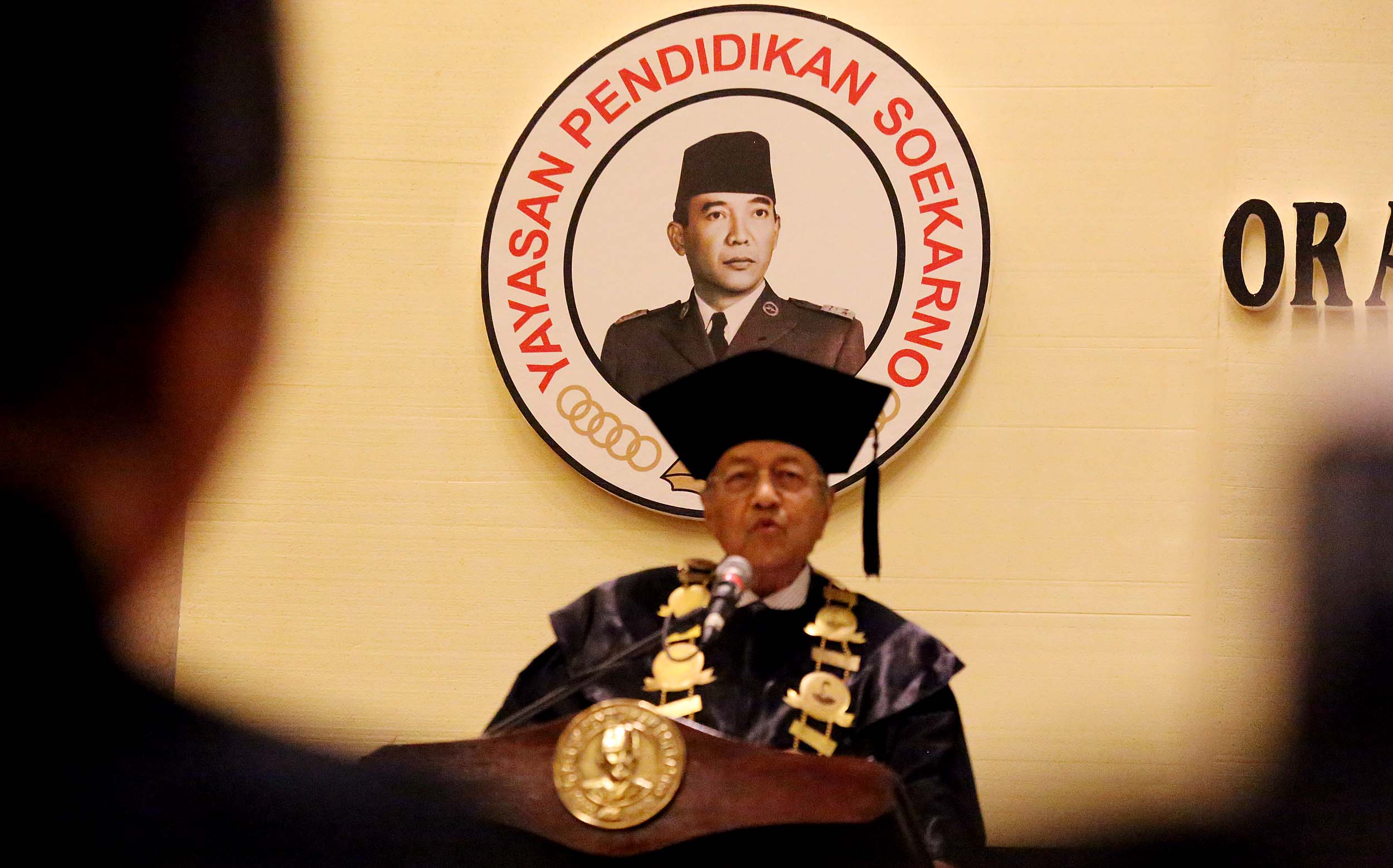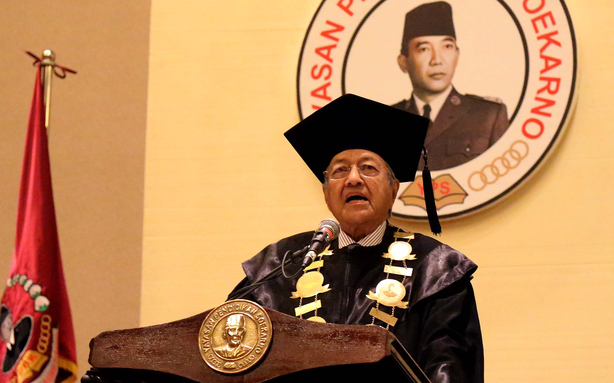 Mantan Perdana Menteri Malaysia Mahathir Mohamad memberikan orasi ilmiah di Jakarta, Senin (25/7/2016). Mahathir Mohamad menyampaikan orasi ilmiah dengan tema Membangun Kemandirian Ekonomi dan Pemerintahan Bersih dalam rangka Dies Natalis ke-17 Universitas Bung Karno (UBK).