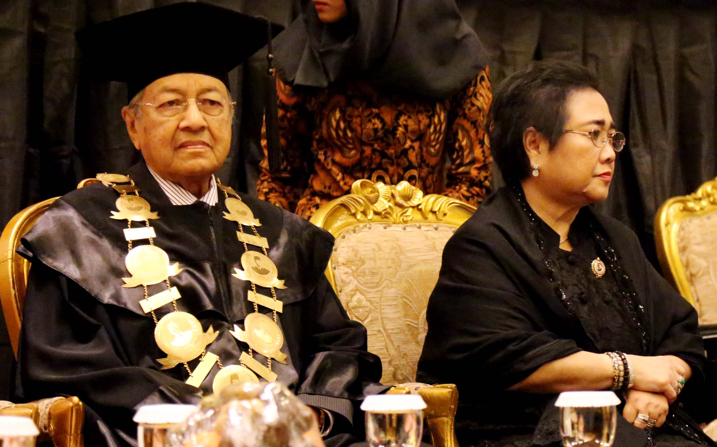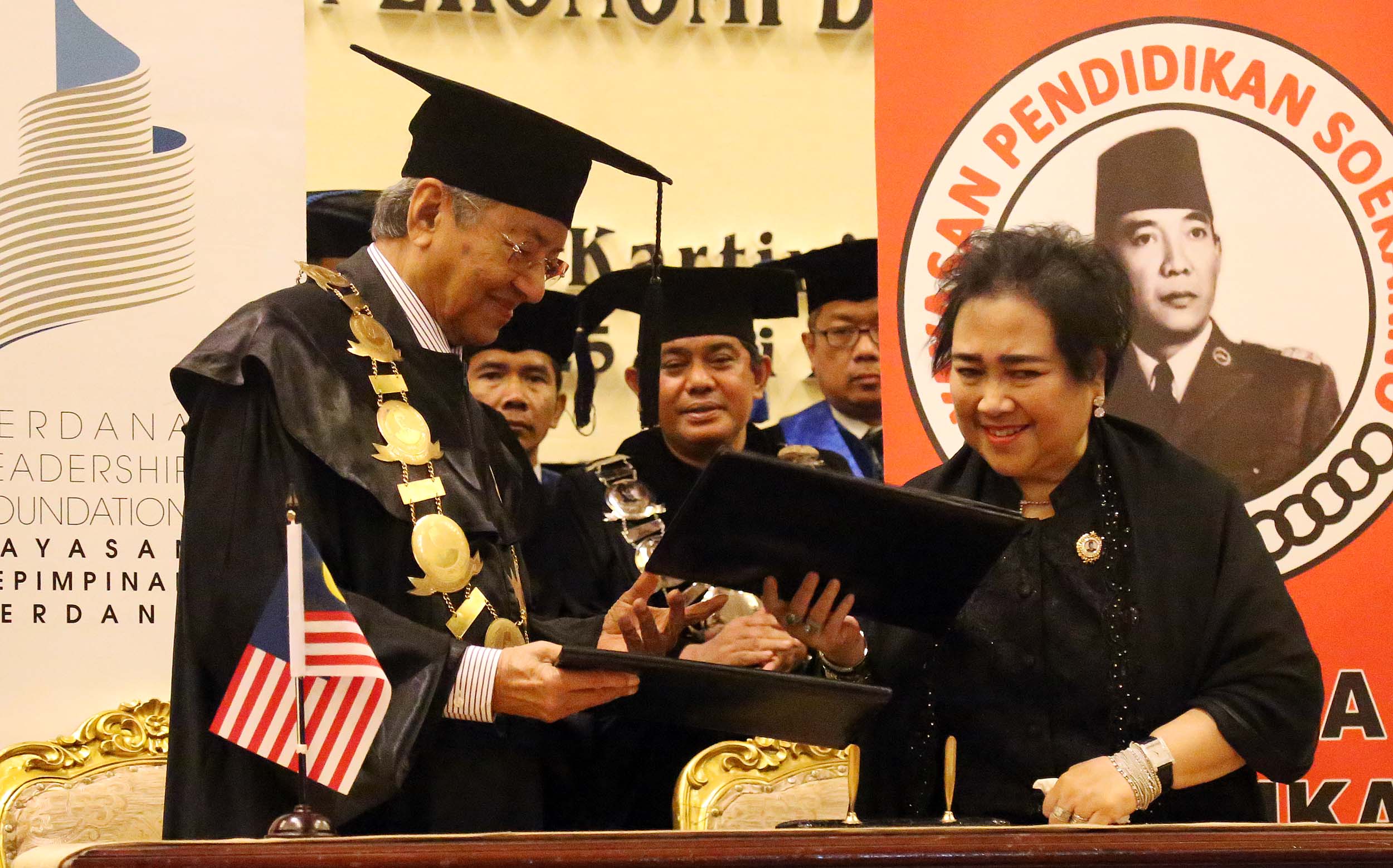 Ketua Pendiri Yayasan Bung Karno Rachmawati Soekarnoputri (kanan) bersama Mantan Perdana Menteri Malaysia Mahathir Mohamad (kiri) mengahadiri acara Dies Natalis Universitas Bung Karno (UBK) ke – 17 di Jakarta, Senin (25/7/2016). Mahathir Mohamad menyampaikan orasi ilmiah dengan tema Membangun Kemandirian Ekonomi dan Pemerintahan Bersih dalam rangka Dies Natalis ke-17 Universitas Bung Karno (UBK).