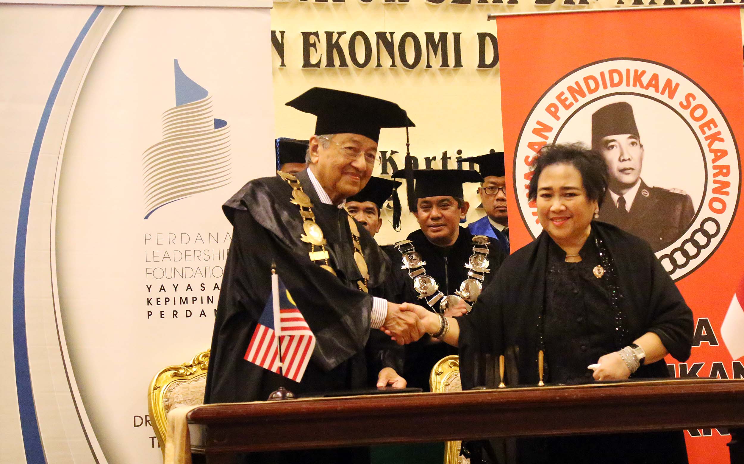 Mantan Perdana Menteri Malaysia Mahathir Mohamad (kiri) berjabat tangan dengan Ketua Pendiri Yayasan Bung Karno Rachmawati Soekarnoputri (kanan) usai melakukan tanda tangan kontrak kerjasama antara Universitas Bung Karno (UBK) dengan Yayasan Kepimpinan Perdana di Jakarta, Senin (25/7/2016). Mahathir Mohamad menyampaikan orasi ilmiah dengan tema Membangun Kemandirian Ekonomi dan Pemerintahan Bersih dalam rangka Dies Natalis ke-17 Universitas Bung Karno (UBK).