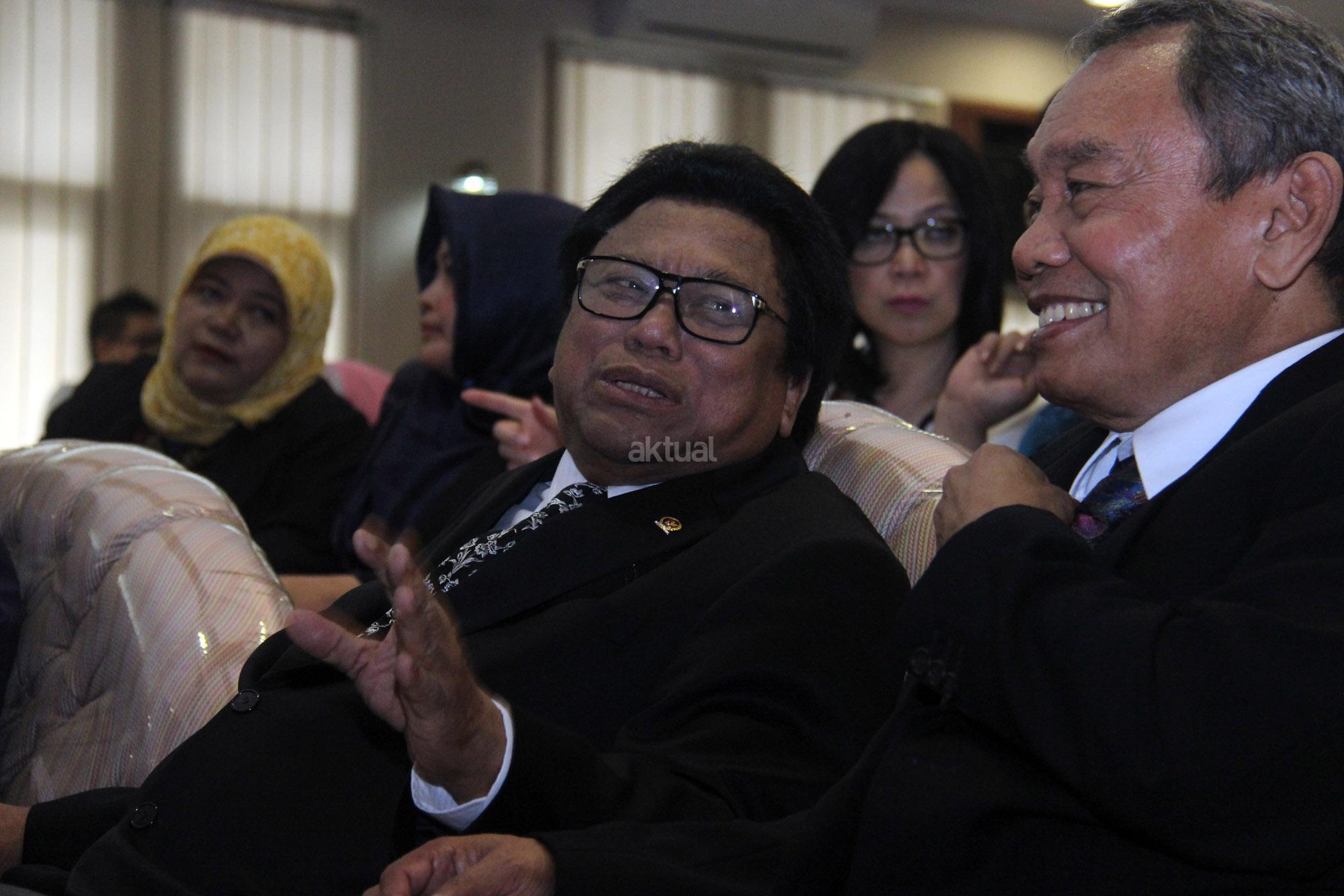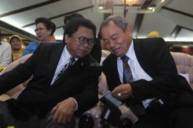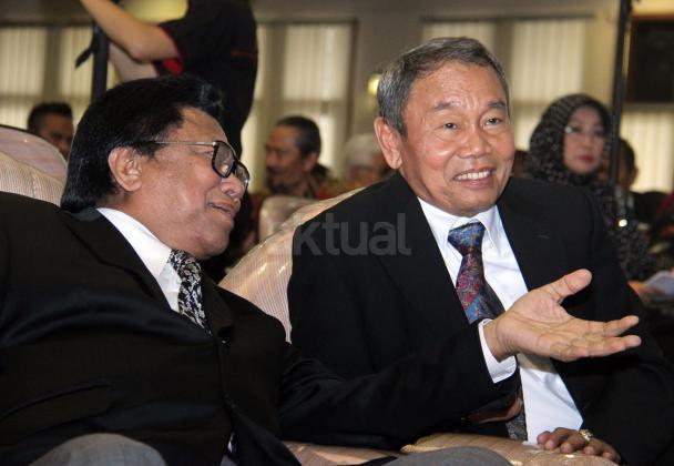 Wakil Ketua MPR Oesman Sapta (kiri) dan Mantan Kepala BNPT Ansyaad Mbai berbincang-bincang saat menghadiri ujian terbuka doktor ilmu ekonomi dari Sumarni Ansyaad Mbai di Universitas Borobudur, Kalimalang, Jakarta, Kamis (17/3/2016). Oesman Sapta Odang mengapresiasi pelaksanaan ujian dokter dilakukan secara terbuka. FOTO: AKTUAL/JUNAIDI MAHBUB