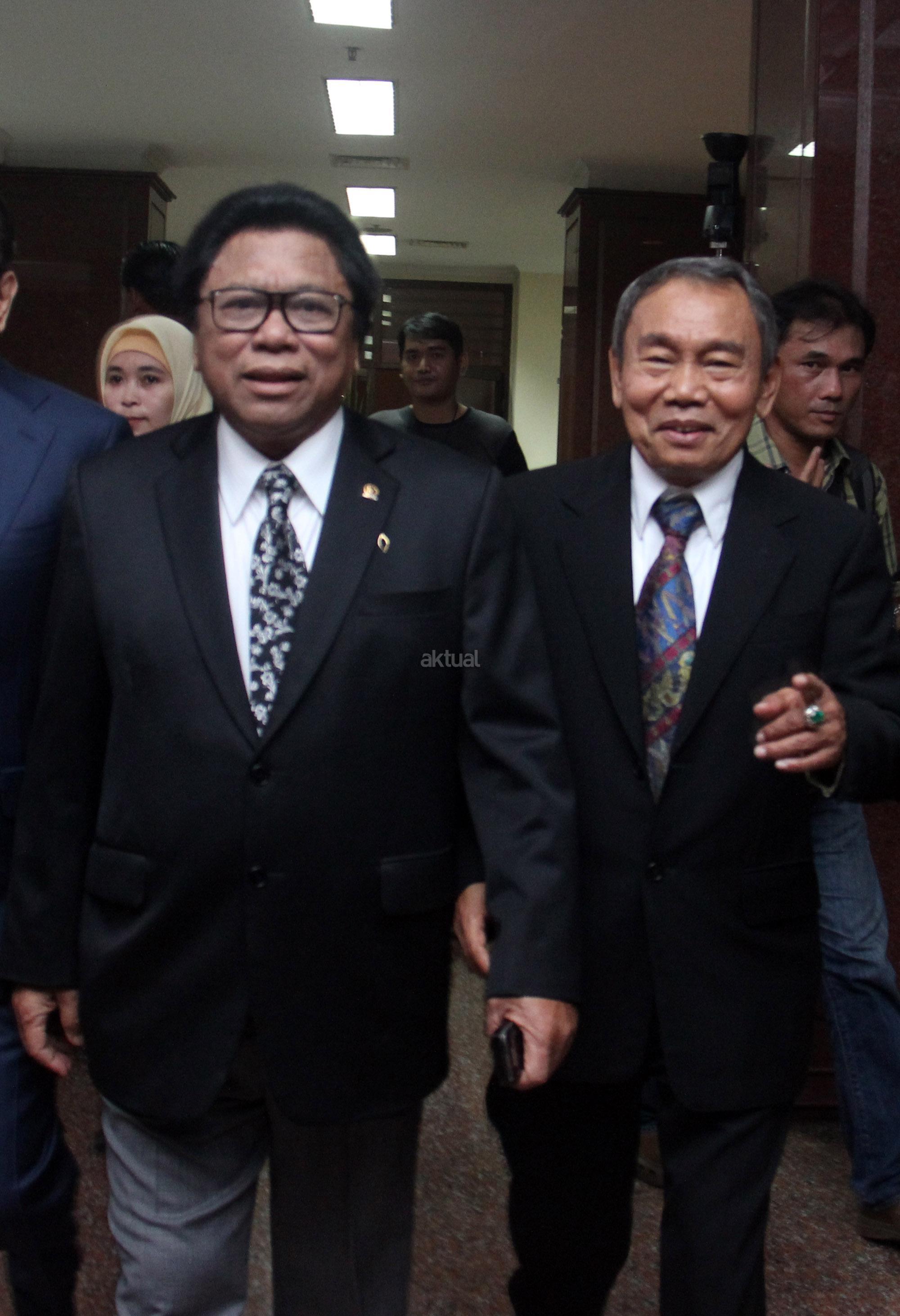Wakil Ketua MPR Oesman Sapta (kiri) dan Mantan Kepala BNPT Ansyaad Mbai setibanya menghadiri ujian terbuka doktor ilmu ekonomi dari Sumarni Ansyaad Mbai di Universitas Borobudur, Kalimalang, Jakarta, Kamis (17/3/2016). FOTO: AKTUAL/JUNAIDI MAHBUB