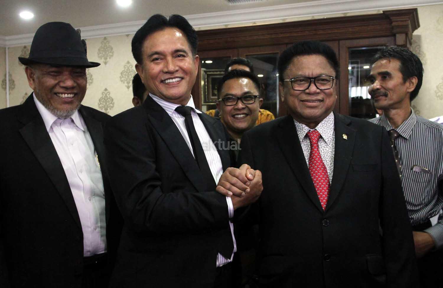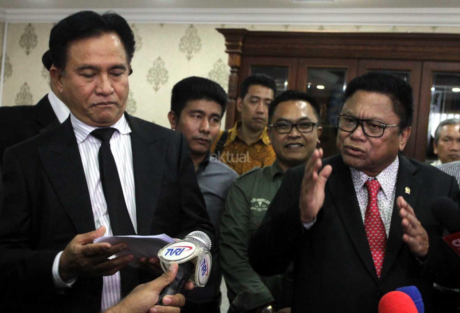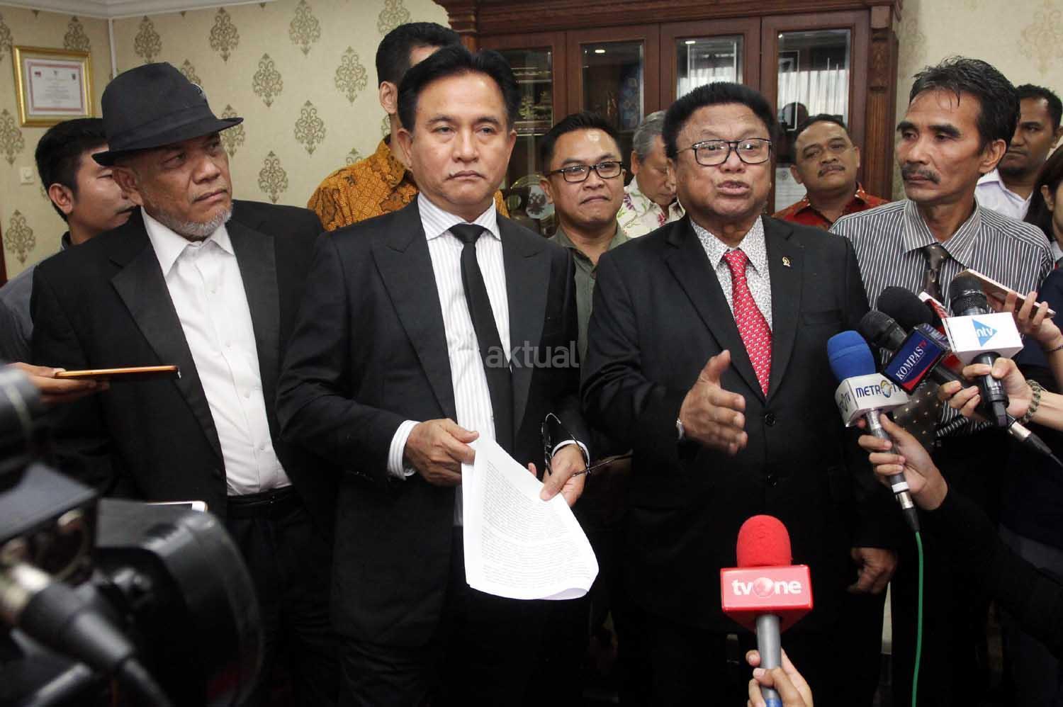 Pengamat Hukum Yusril Ihza Mahendra bersama Ketua Dewan Pertimbangan Daerah (DPD) Oesman Sapta, memberikan keterangan soal putusan Mahkamah Konstitusi (MK) Nomor 30/PUU-XVI/2018 dan Keberlakuannya Terhadap Bakal Calon Anggota DPD yang ‘Pekerjaannya’ Fungsionaris Partai Politik di Gedung Parlemen, Senayan, Jakarta, Kamis (26/7/2018) Menurut Oso, keputusan MK itu dikeluarkan tanpa adanya konsultasi dengan DPD selaku pihak terkait. Oso yang juga menjabat sebagai Ketua Umum Partai Hanura ini bahkan menganggap MK telah mengorbankan DPD dan juga KPU dalam amar putusannya. AKTUAL/Tino Oktaviano