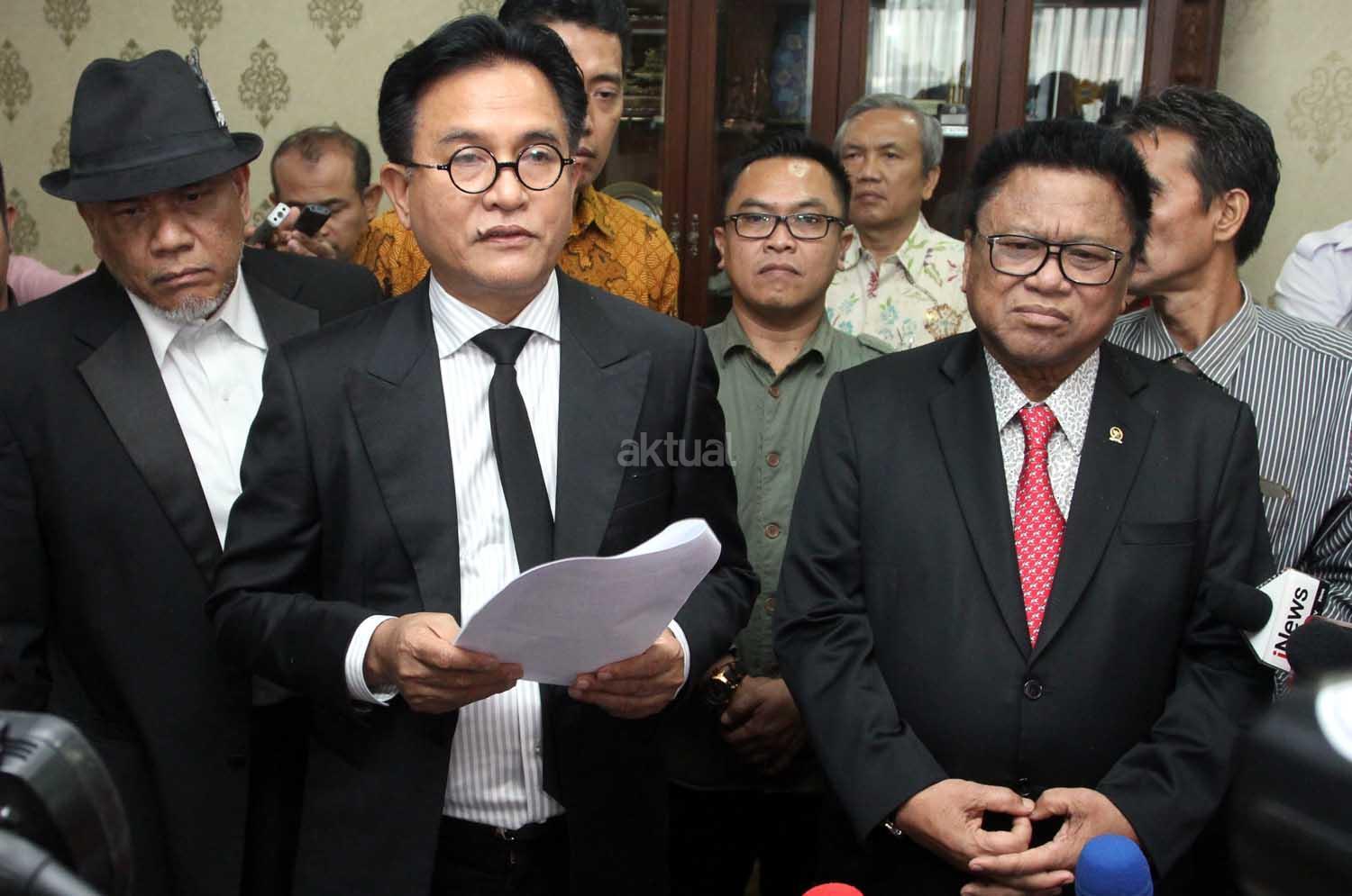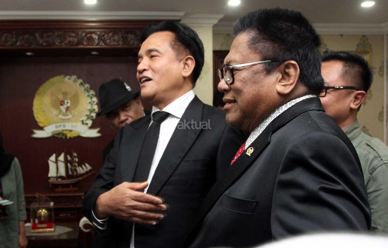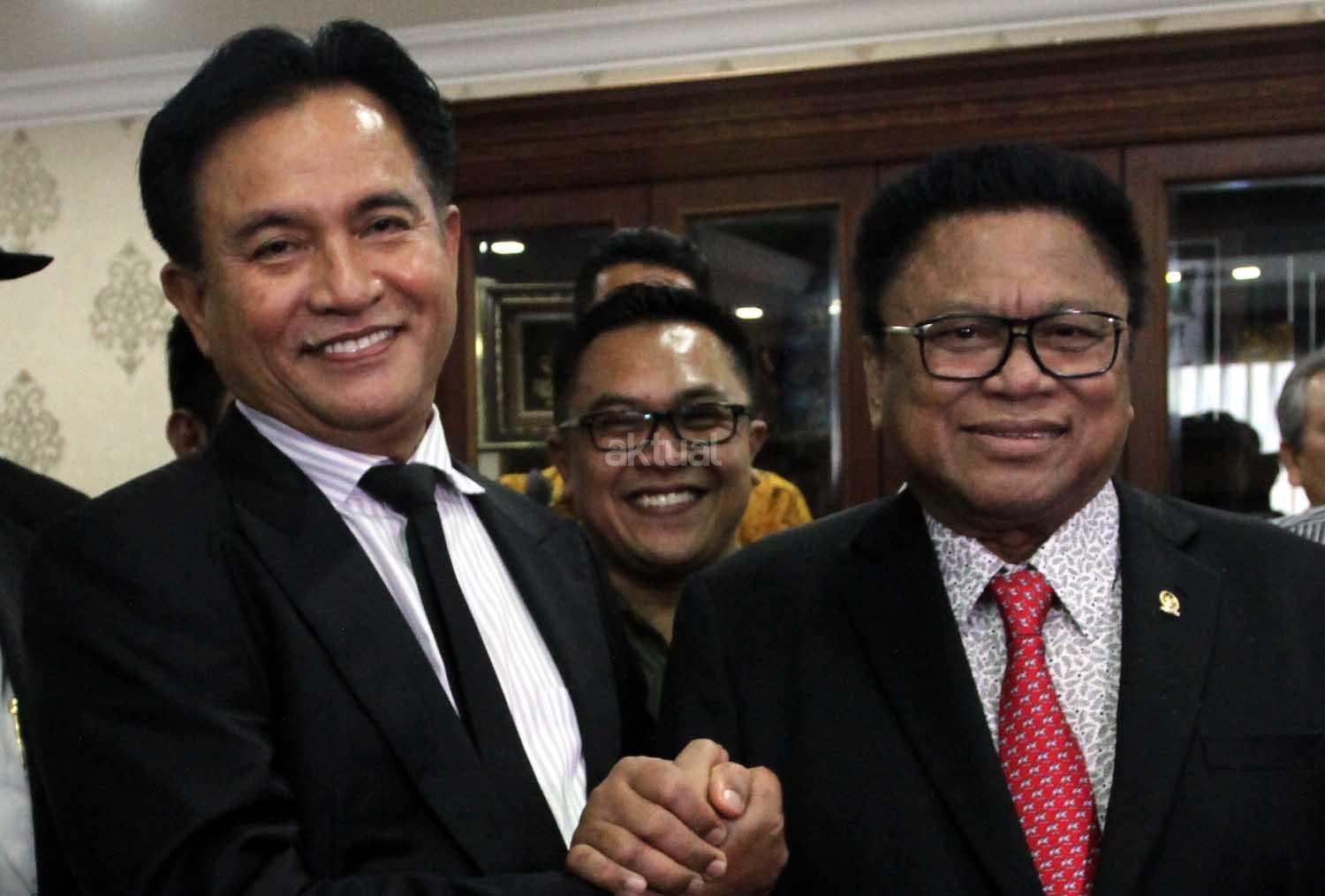 Pengamat Hukum Yusril Ihza Mahendra bersama Ketua Dewan Pertimbangan Daerah (DPD) Oesman Sapta, memberikan keterangan soal putusan Mahkamah Konstitusi (MK) Nomor 30/PUU-XVI/2018 dan Keberlakuannya Terhadap Bakal Calon Anggota DPD yang ‘Pekerjaannya’ Fungsionaris Partai Politik di Gedung Parlemen, Senayan, Jakarta, Kamis (26/7/2018) Menurut Oso, keputusan MK itu dikeluarkan tanpa adanya konsultasi dengan DPD selaku pihak terkait. Oso yang juga menjabat sebagai Ketua Umum Partai Hanura ini bahkan menganggap MK telah mengorbankan DPD dan juga KPU dalam amar putusannya. AKTUAL/Tino Oktaviano