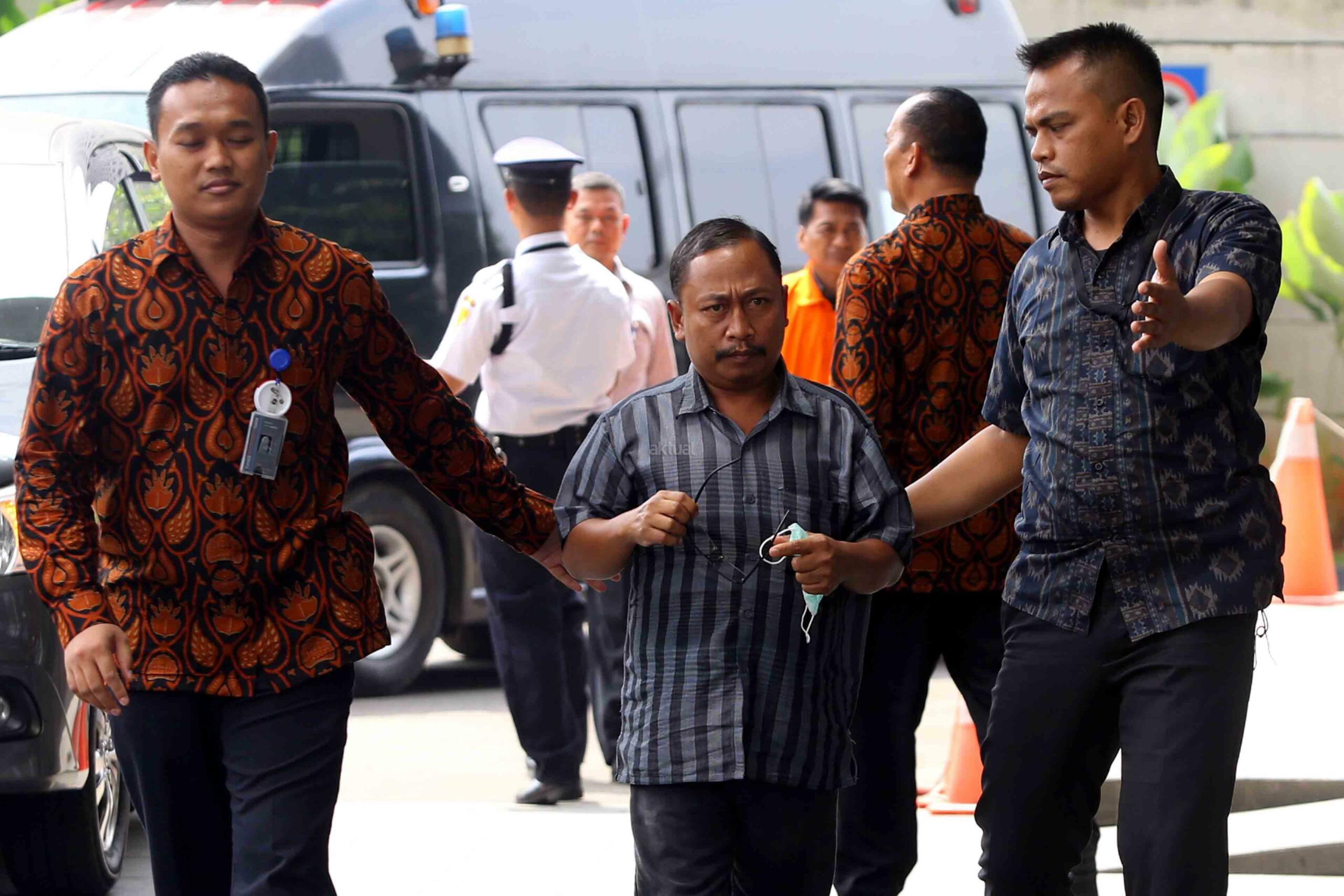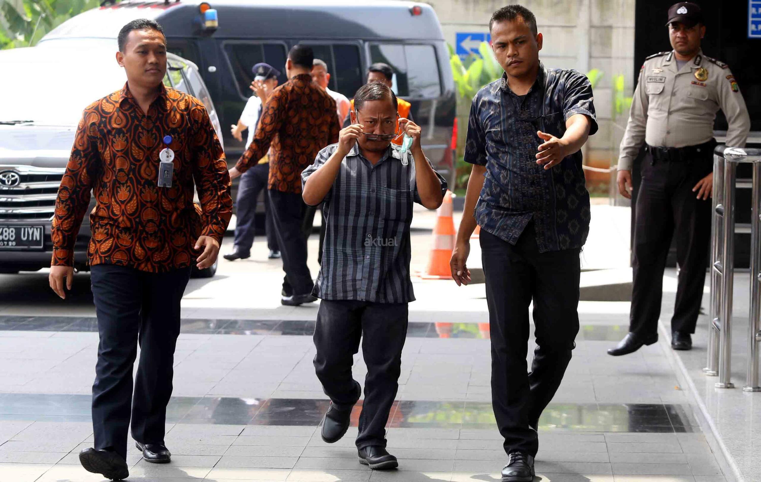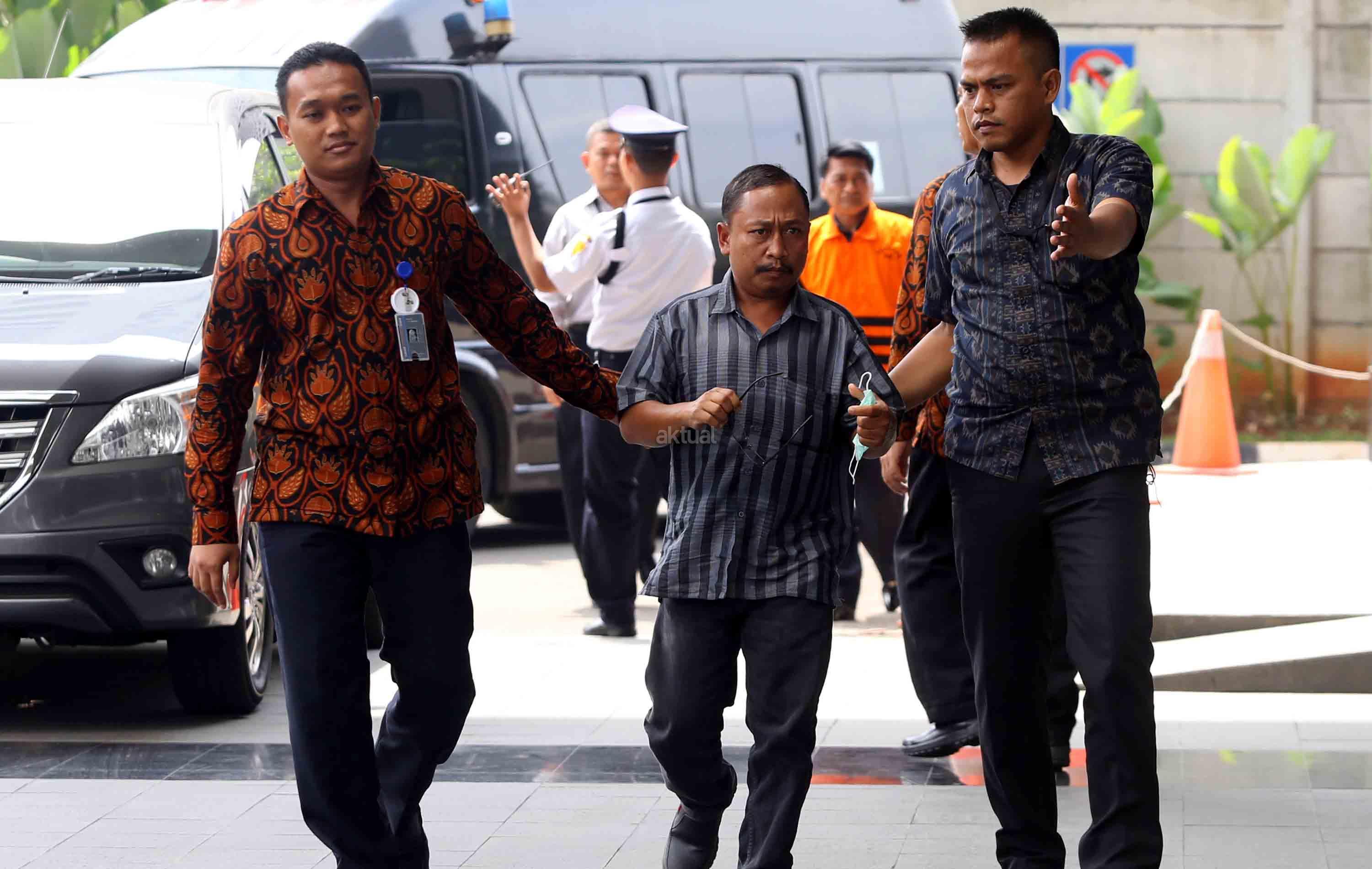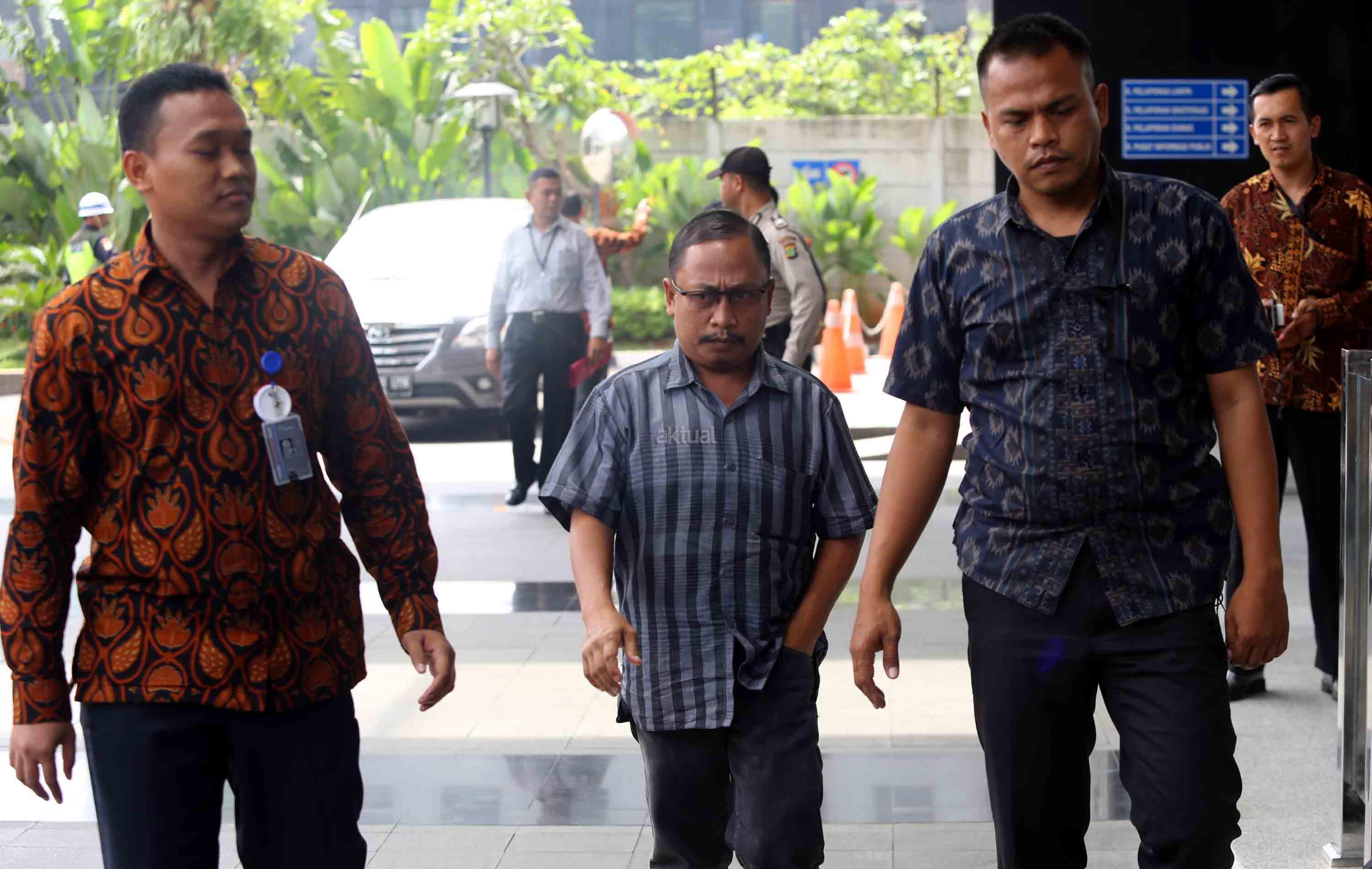 Pengusaha jasa konstruksi Juhari (tengah) digiring petugas untuk menjalani pemeriksaan, di gedung Komisi Pemberantasan Korupsi (KPK), Jakarta, Rabu (16/5). KPK melakukan Operasi Tangkap Tangan (OTT) terhadap Bupati Bengkulu Selatan Dirwan Mahmud di kediamannya dan mengamankan istrinya, Heni Dirwan, wiraswasta JU dan WA dengan barang bukti uang sekitar Rp100 juta. AKTUAL/Tino Oktaviano