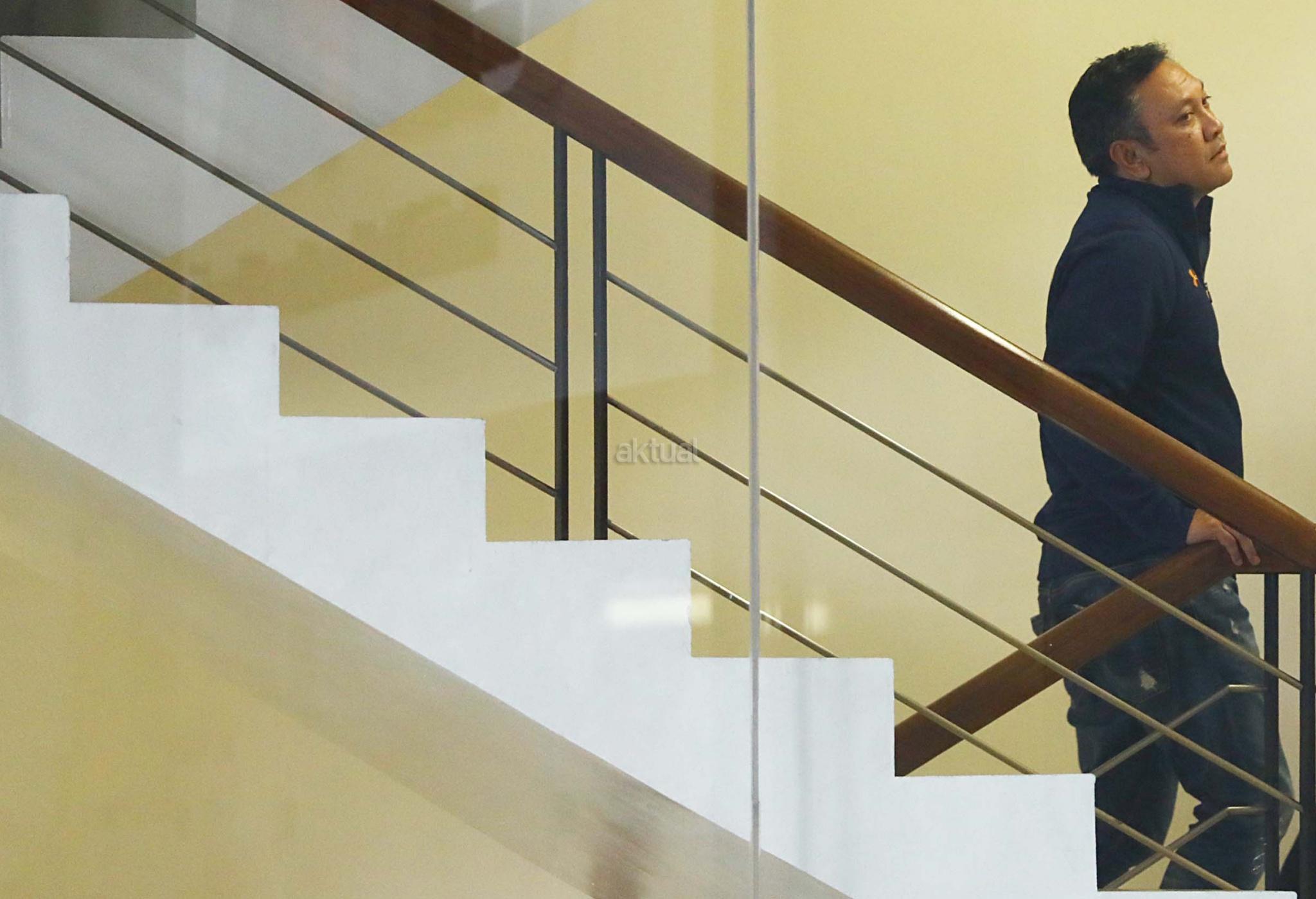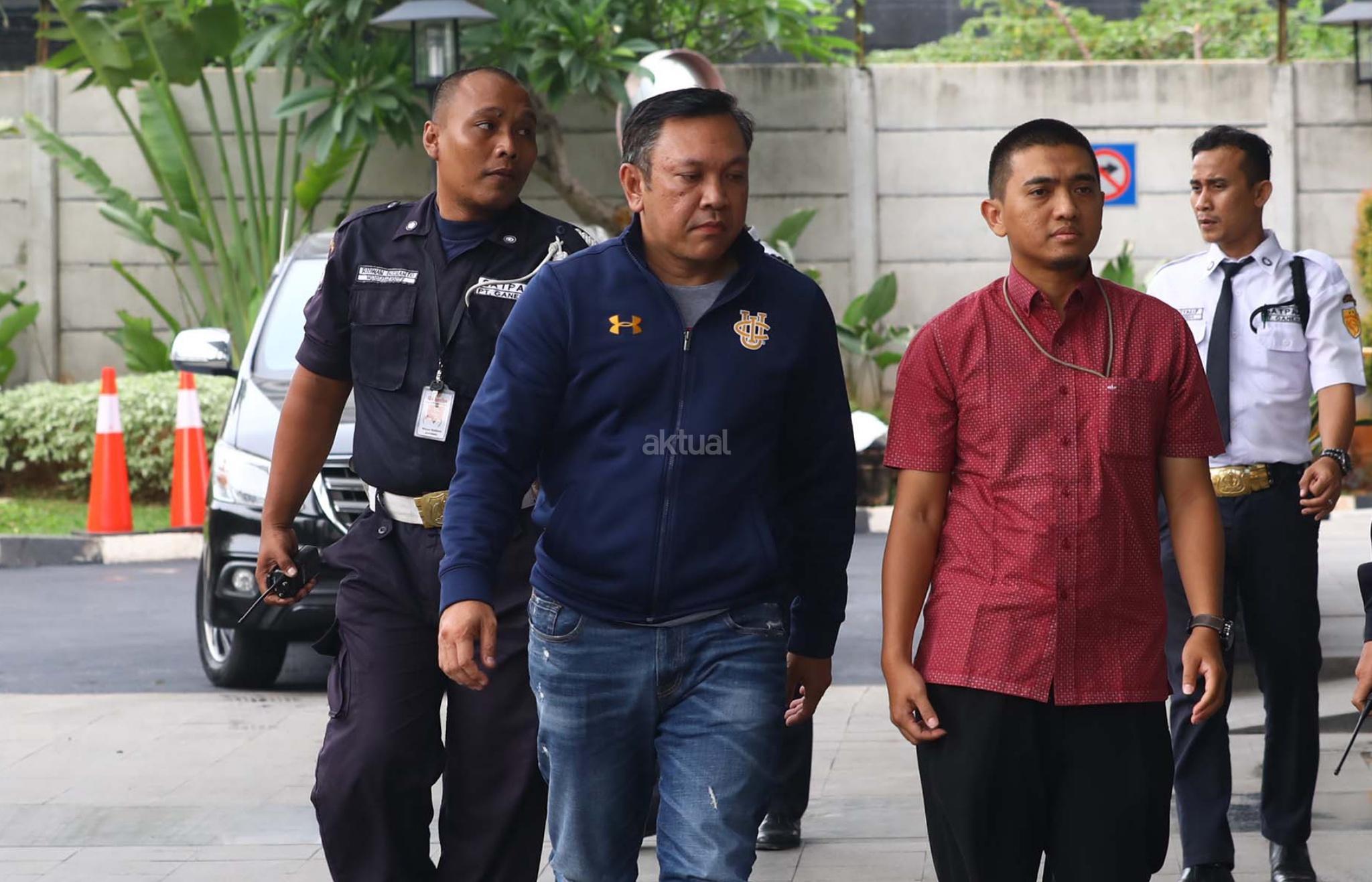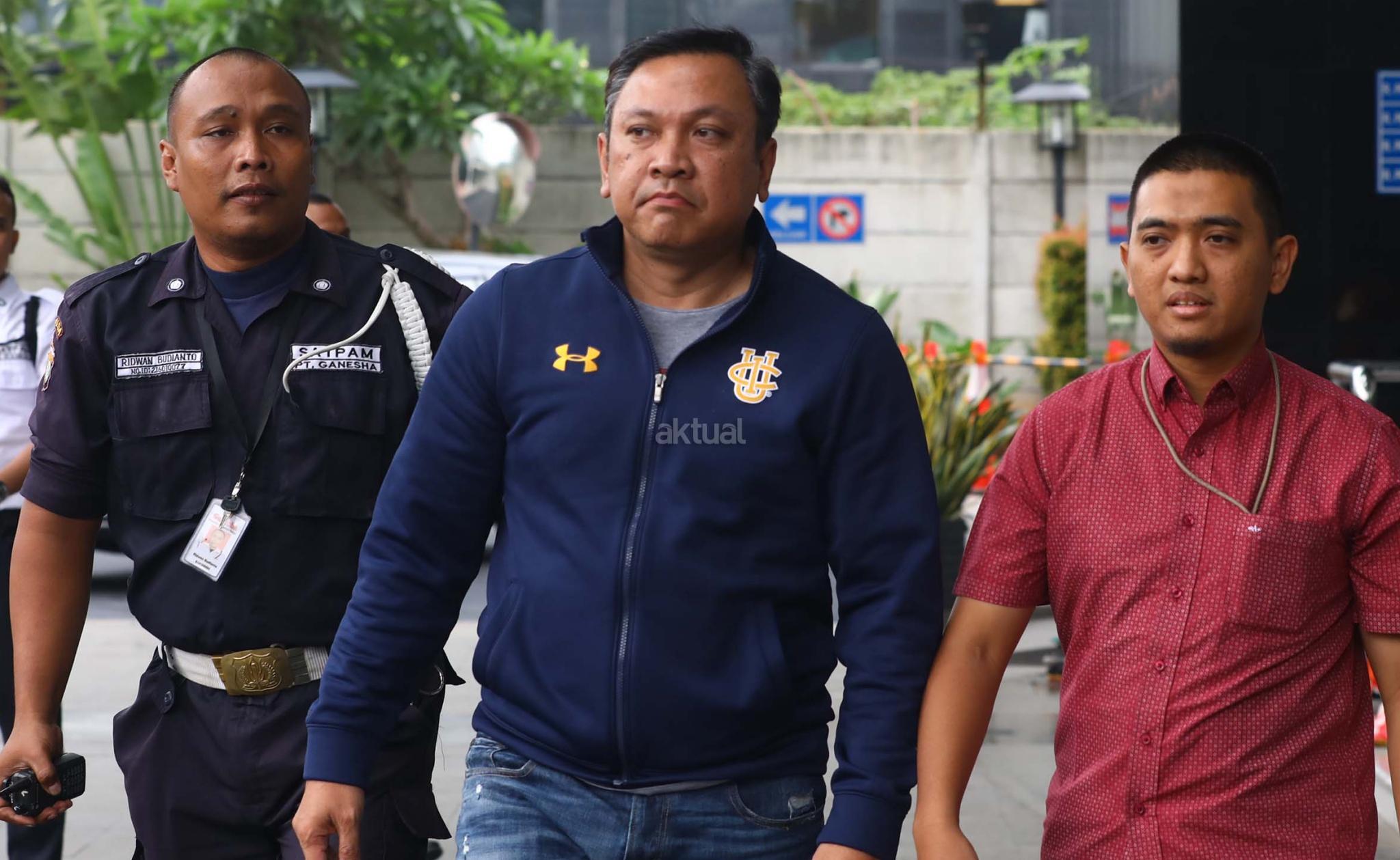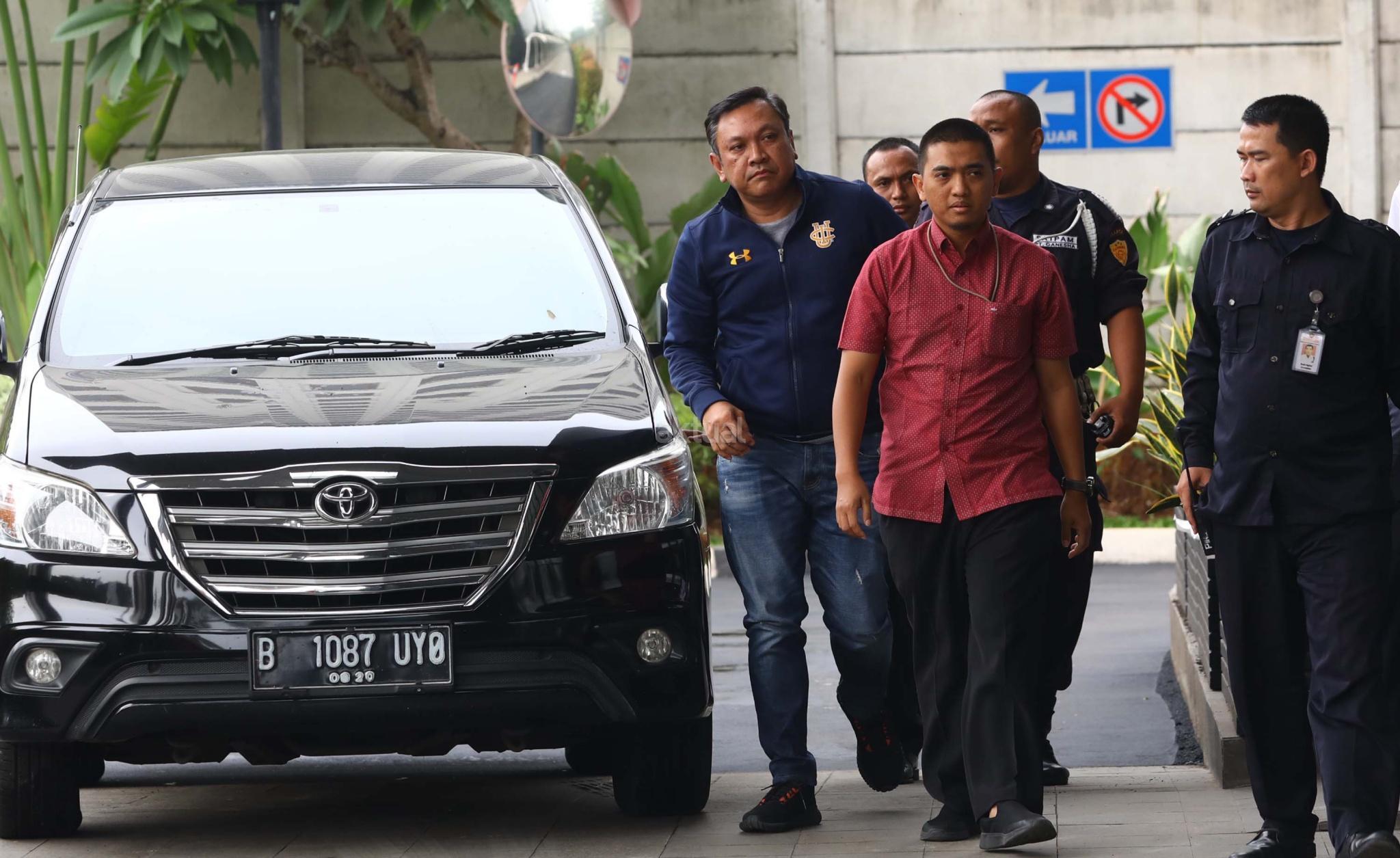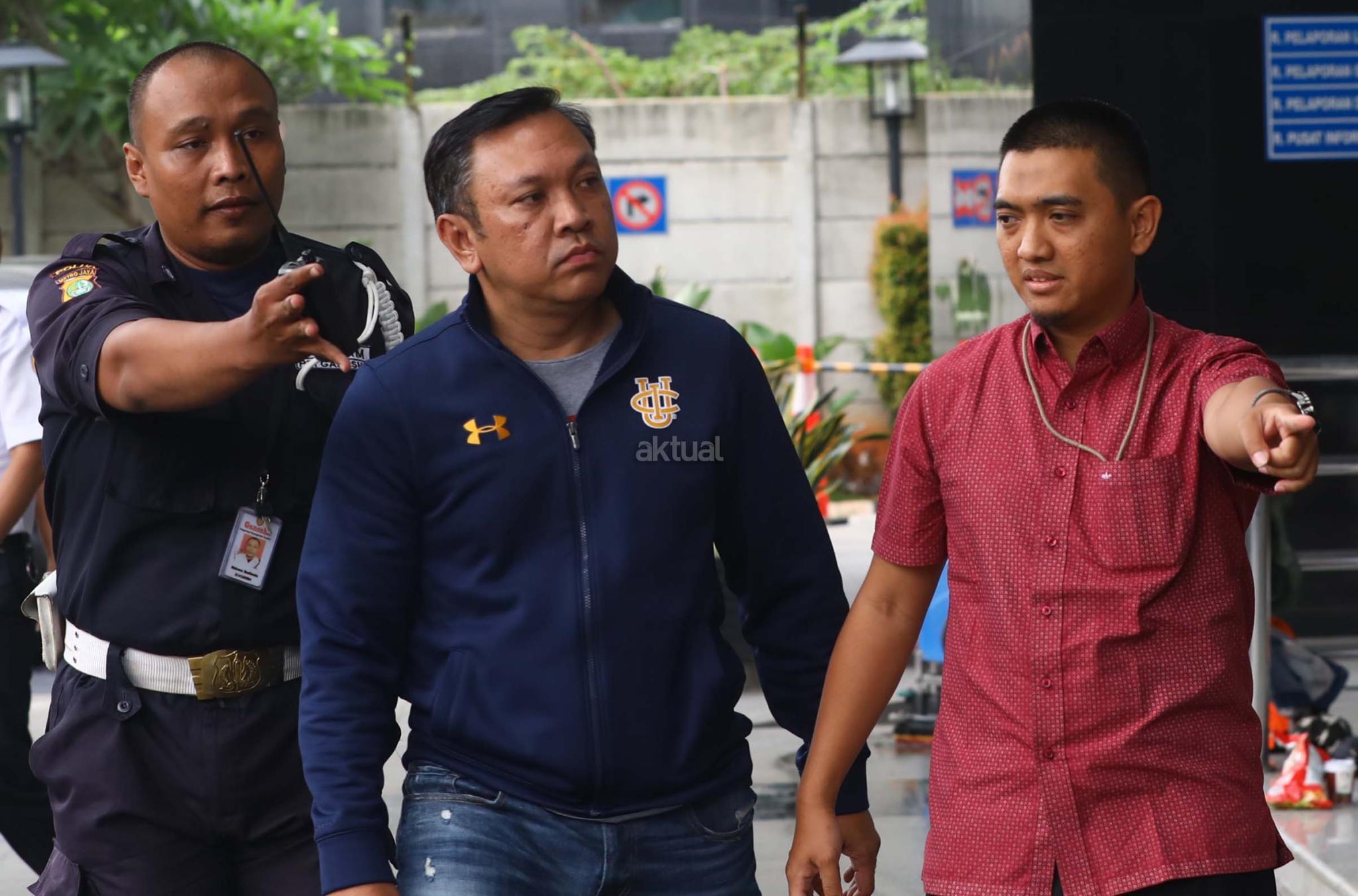 Bupati Pakpak Bharat Remigo Yolando Berutu (tengah) dikawal petugas KPK saat diamankan ke gedung KPK, Jakarta, Minggu (18/11/2018). Politikus Partai Demokrat itu diamankan KPK seusai terjaring operasi tangkap tangan (OTT) terkait dugaan suap proyek di Dinas PUPR Pakpak Bharat, Sumatera Utara. AKTUAL/Tino Oktaviano