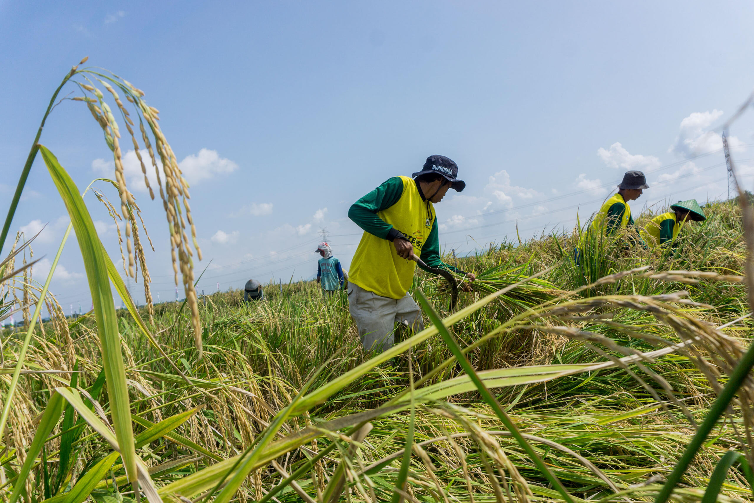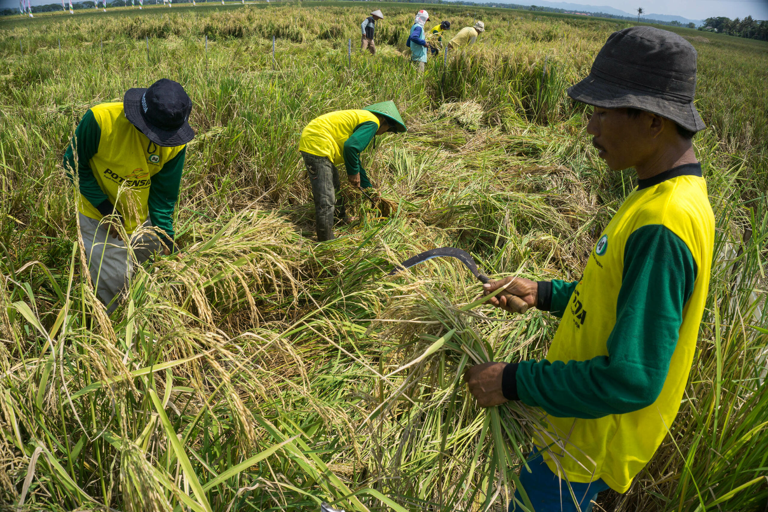 Sejumlah petani memanen padi hibrida HIPA 18 di lahan demonstasi plot (demplot) Desa Mrenek, Maos, Cilacap, Jateng, Sabtu (12/3). Hasil panen padi hibrida HIPA 18 yang dikembangkan Balai Besar Penelitian Tanaman Padi bersama PT. Petrokimia Gresik mencapai 10,2 ton per hektar, dan mempunyai ketahanan terhadap penyakit blas dan hama wereng. ANTARA FOTO/Idhad Zakaria/nz/16