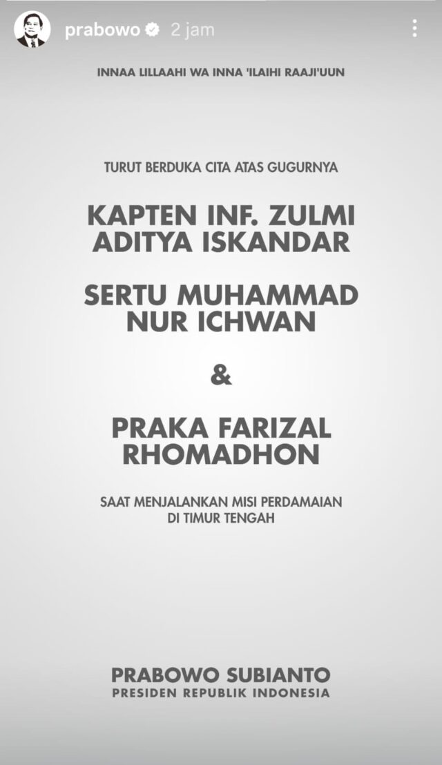 “Innalillahi wa inna ilaihi rajiun. Turut berduka cita atas gugurnya Kapten Inf. Zulmi Aditya Iskandar, Sertu Muhammad Nur Ichwan, dan Praka Farizal Rhomadon saat menjalankan misi perdamaian di Timur Tengah,” ujar Prabowo.