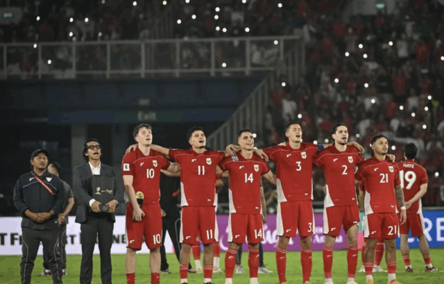 Sejumlah pesepak bola dan staf Timnas Indonesia menyanyikan lagu Tanah Airku usai mengalahkan Timnas Bahrain pada laga Grup C putaran ketiga Kualifikasi Piala Dunia 2026 Zona Asia di Stadion Utama Gelora Bung Karno, Senayan, Jakarta, Selasa (25/3/2025). (ANTARA FOTO/Hafidz Mubarak A/app/Spt.)