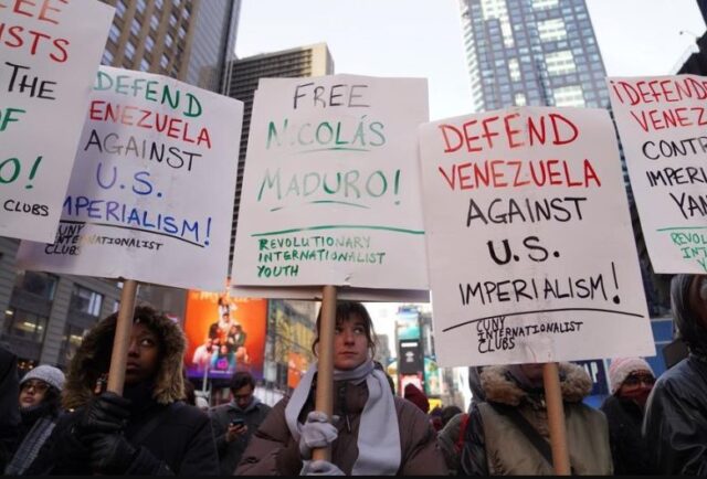 Para pengunjuk rasa berkumpul di Times Square sambil membawa berbagai poster yang bertuliskan “Jangan ganggu Venezuela”, “AS, keluar dari Karibia”, “Tolak perang untuk minyak Venezuela”, dan “Pertahankan Venezuela dari imperialisme AS”. Teriakan berbunyi “Pertahankan Venezuela, Bebaskan Maduro” bergema di tengah kerumunan massa.