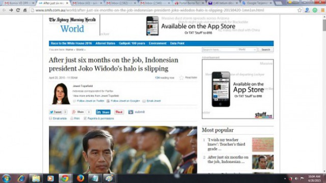 Sementara itu, Sydney Morning Herald juga menyoroti survei popularitas Jokowi yang terus melorot saat menjadi Presiden RI.
