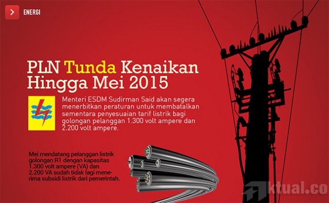 Jakarta, Aktual.co — Pemerintah menunda kebijakan terkait kenaikan tarif listrik yang seharusnya mulai berlaku hari ini, 1 April 2015. Menurut rencana, Menteri Energi dan Sumber Daya Mineral (ESDM) Sudirman Said akan segera menerbitkan peraturan untuk membatalkan sementara penyesuaian tarif listrik bagi golongan pelanggan 1.300 volt ampere (VA) dan 2.200 VA.