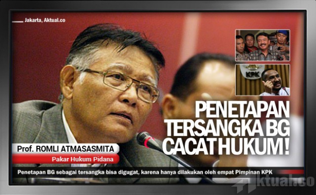 Jakarta, Aktual.co — Pakar hukum pidana Prof Romly Kartasasmita menilai, penetapan Komisaris Jenderal Polisi Budi Gunawan sebagai tersangka cacat hukum. Pasalnya penetapan BG sebagai tersangka tidak diputuskan oleh lima pimpinan Komisi Pemberantasan Korupsi.