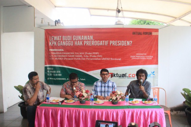 “KPK ini sudah bukan lagi sebagai lembaga pencegahan dan penindakan, tetapi sudah menjadi lembaga screaning dalam melihat seseorang,” kata Nasir dalam acara diskusi Aktual Forum bertajuk ‘Lewat Budi Gunawan, KPK Ganggu Hak Preogratif Presiden?, di Warung Komando, Jalan Dr Saharjo, Tebet, Jakarta Selatan, Minggu (18/1).