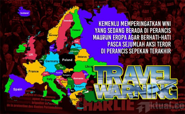 Pemerintah Indonesia melalui Kementerian Luar Negeri (Kemenlu) memberikan peringatan perjalanan (travel warning) kepada Warga Negara Indonesia (WNI) yang sedang bepergian ke Perancis atau negara-negara Eropa lainnya, agar berhati-hati pasca-sejumlah aksi teror yang melanda kota Paris dalam sepekan terakhir. “WARNING kepada WNI yang akan bepergian ke Perancis & negara Eropa lainnya: Hati2 & cepat hubungi KBRI/Perwakilan RI terdekat jika terjadi sesuatu,” demikian bunyi travel warning Pemerintah RI yang disiarkan melalui situs website Kemenlu RI (www.kemlu.go.id) dan akun twitter @Portal_Kemlu.