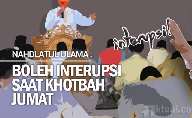 Pendapat yang membolehkan interupsi terhadap pengkhotbah dalam salat Jumat ini beredar di media sosial belakangan ini. Keluarnya fatwa boleh menginterupsi khotbah ngawur ini bermula dari pertanyaan seseorang bernama Hasanuddin yang dimuat di laman tersebut pada Kamis, (31/7/14), pada pukul 09.09 WIB. Pertanyaan itu dijawab Ustad Mahbub Maafi Ramdlan di laman yang sama.