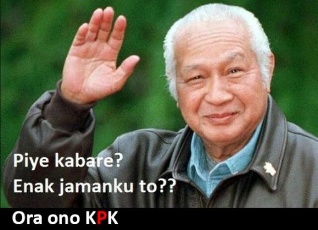 Karena itu ironis, jika ada yang meyakini jaman Soeharto sebagai jaman lebih enak, ternyata enak yang dimaksudkan malah enak bisa leluasa ber-KKN alias korupsi, kolusi, dan nepotisme. Sebab semasa Soeharto, tidak ada lembaga anti rasuah seperti KPK, Komisi Pembrantasan Korupsi, yang diharapkan semakin bersikap tegas menindak para koruptor dan nepotis yang berkolusi mencuri uang rakyat.