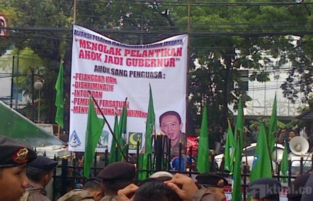 Jakarta, Aktual.co —Mahasiswa dari Aliansi Pelajar Jakarta geruduk Gedung DPRD DKI Jakarta menyatakan menolak pelantikan Plt Gubernur DKI Basuki Tjahaja Purnama (Ahok), sekitar pukul 14.00Wib usai sholat Jumat.