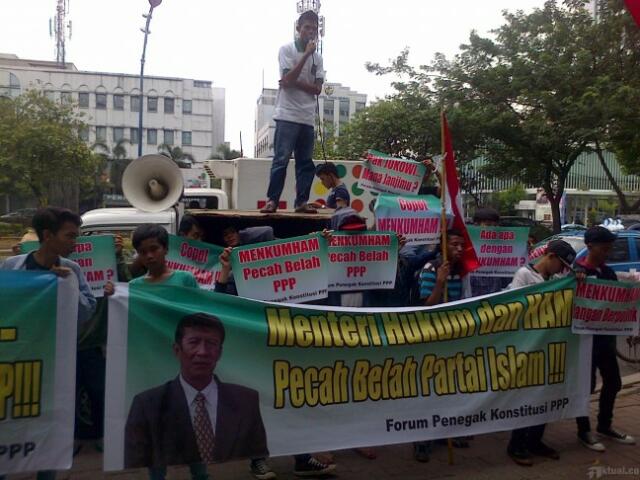 Jakarta, Aktual.co — Ratusan kader PPP berunjukrasa di depan gedung Kementerian Hukum dan HAM menanggapi munculnya SK Kemenkum dan HAM tentang pengesahan kepengurusan salah satu kubu. Massa yang datang dengan satu bus metro mini ini menamakan dirinya Forum Penegak Konstitusi PPP.