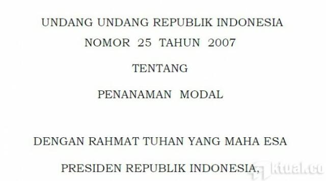 UU No. 25 Tahun 2007 Pasal 6 ayat (1) yang menyebut, pemerintah memberikan perlakuan yang sama kepada semua penanam modal yang berasal dari negara mana pun yang melakukan kegiatan penanaman modal di Indonesia sesuai dengan ketentuan peraturan perundang-undangan.