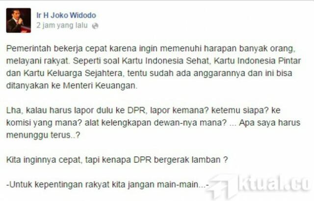 “Kita inginnya cepat, tapi kenapa DPR bergerak lamban? Untuk kepentingan rakyat kita jangan main-main…,” tulis Presiden.