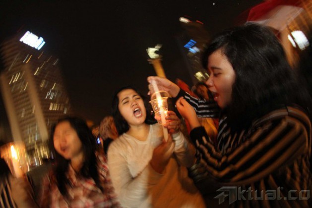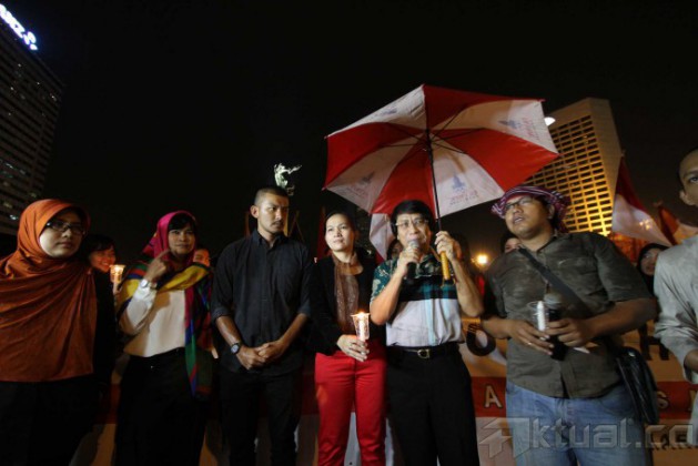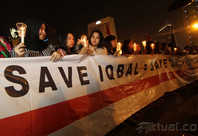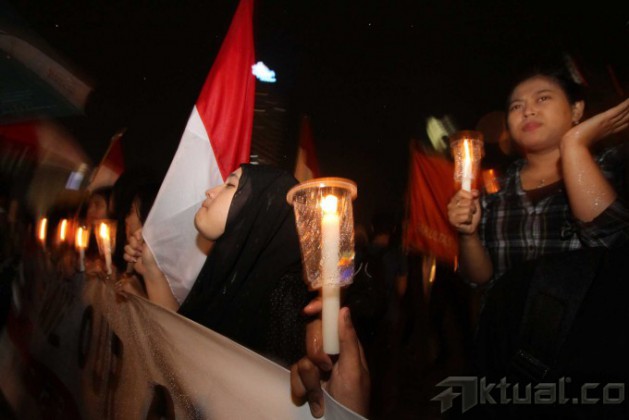 Warga bersama pemerhati anak dan Komisi Perlindungan Anak Indonesia (KPAI) melakukan aksi menyalakan lilin di Bundaran hotel Indonesia, Jakarta, Kamis (20/3/2014) malam. Aksi damai “Gerakan Sayang Anak” merupakan bentuk solidaritas kepada korban penculikan dan kekerasan Iqbal Saputra 3,5 tahun. Mereka mengecam kekerasan yang terjadi karena melanggar hak asasi manusia dan berharap pelaku dapat dihukum seberat-beratnya. Aktual/Tino Oktaviano