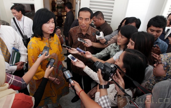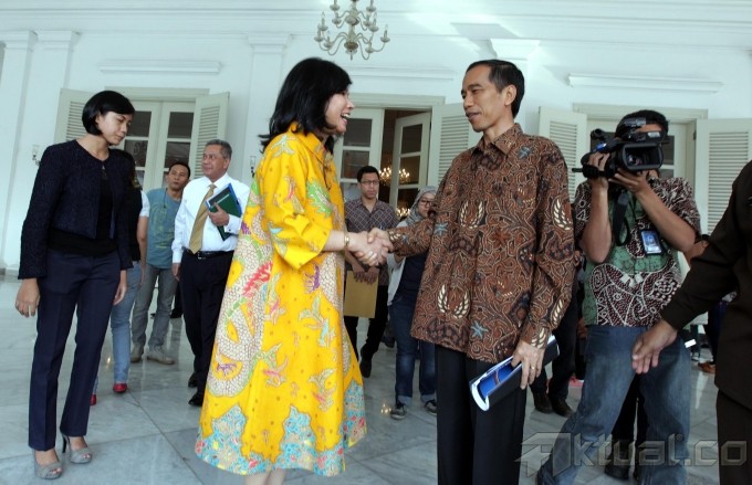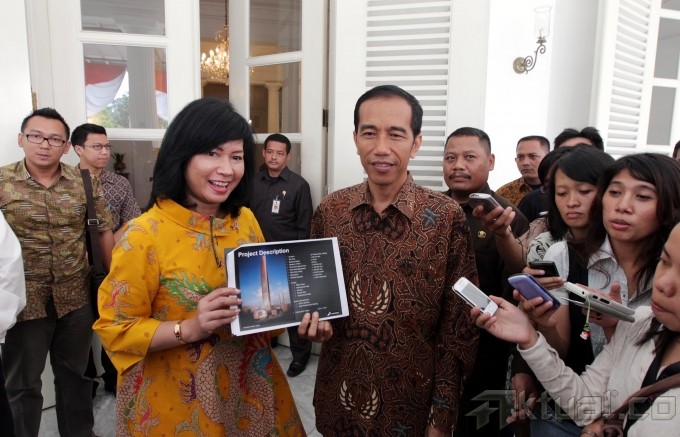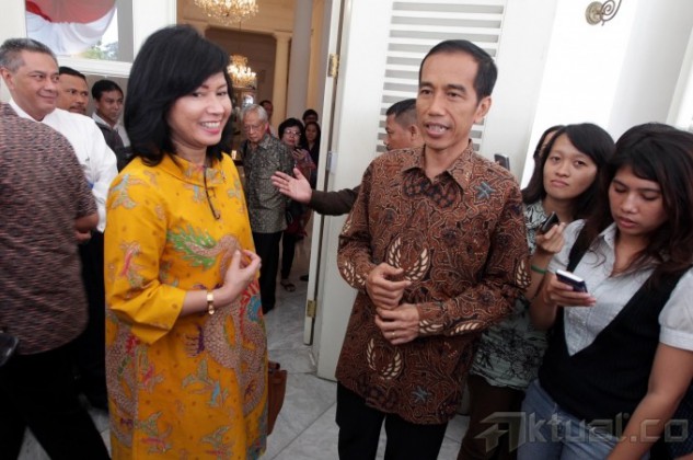 Direktur Utama Pertamina Karen Agustiawan (kiri) bersama Gubernur DKI Jakarta Joko Widodo berbincang usai mengadakan pertemuan membahas tower Jakarta di Balai Kota, Jakarta, Kamis (22/8). Karen datanga untuk meminta izin pembangunan Pertamina Tower di Jakarta yang bakal menjadi gedung tertinggi di Indonesia. Groundbreaking atau peletakan batu pertama gedung dengan 99 lantai tersebut akan dimulai pada September 2013. Aktual/Tino Oktaviano