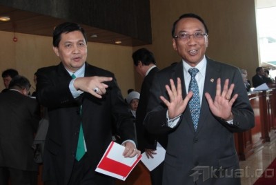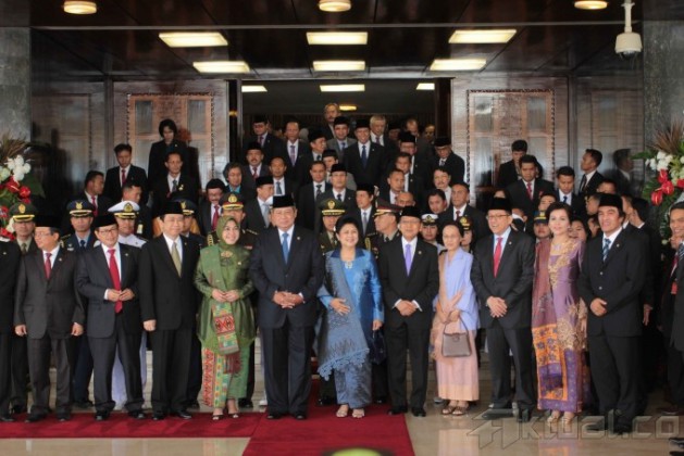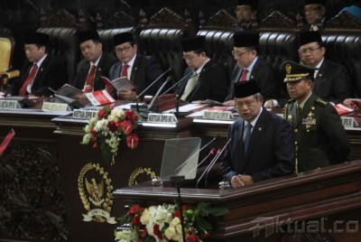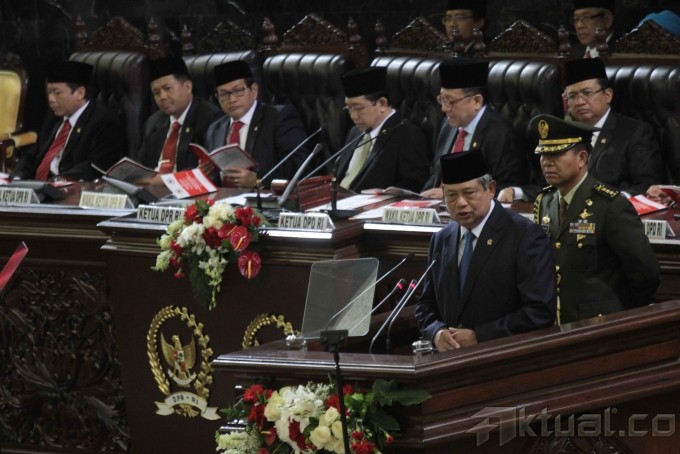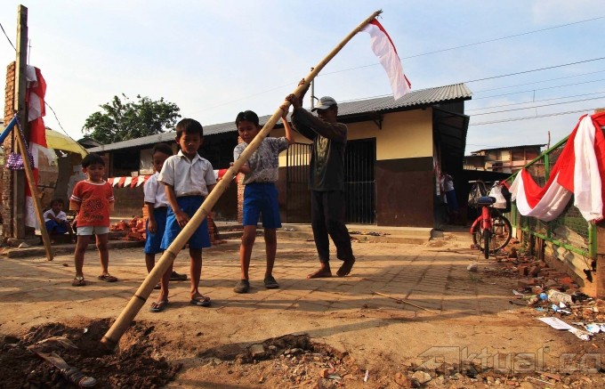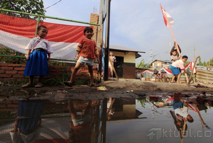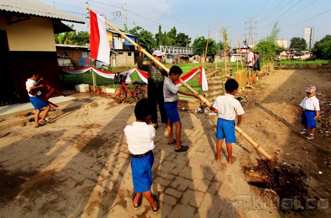 Siswa siswi melakukan upacara menggunakan bambu tanpa pengibaran bendera dalam rangka memperingati HUT ke-68 RI di Sekolah Darurat Kartini di Jalan Lodan Raya, Kelurahan Ancol, Kecamatan Pademangan, Jakarta Utara, Rabu (13/3). Sekolah Darurat Kartini dikelola oleh dua kakak beradik kembar menampung 621 siswa-siswi yang kurang mampu dari berbagai kalangan yang tinggal di bawah kolong jalan tol dan anak-anak yang tinggal di daerah pinggir kali untuk tingkat TK, SD, SMP dan SMU tanpa dipungut biaya sepeser pun. Aktual/Tino Oktaviano