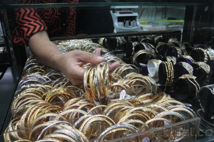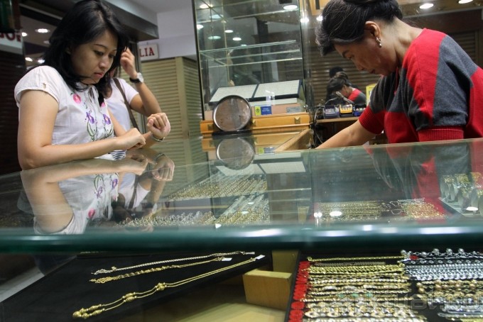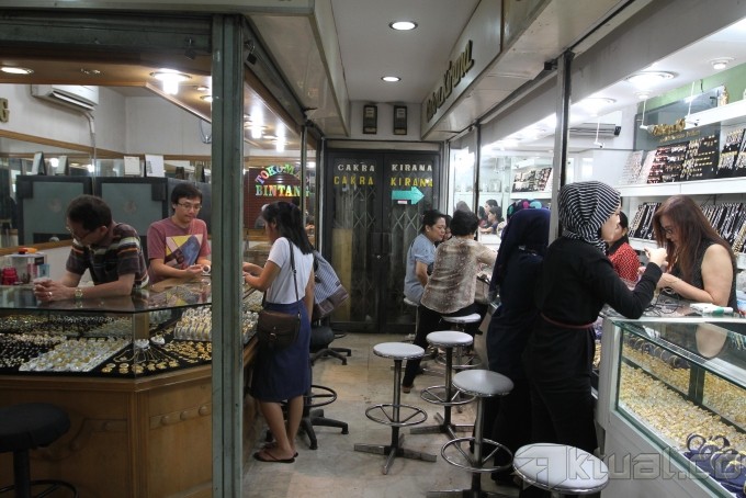 Penjual Emas melayani jual beli emas di pasar Emas, Cikini, Jakarta Pusat, Selasa (13/8). Harga emas batangan di Unit Bisnis Pengolahan dan Penjualan PT Aneka Tambang hingga hari ini masih stagnan. Hari ini, harga emas di Jakarta berada pada kisaran Rp 464.600 hingga Rp 504.000. Harga tersebut mulai terbesar untuk ukuran 1 gram dan harga terkecil untuk ukuran 500 gram. Aktual/Tino Oktaviano