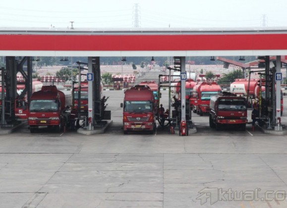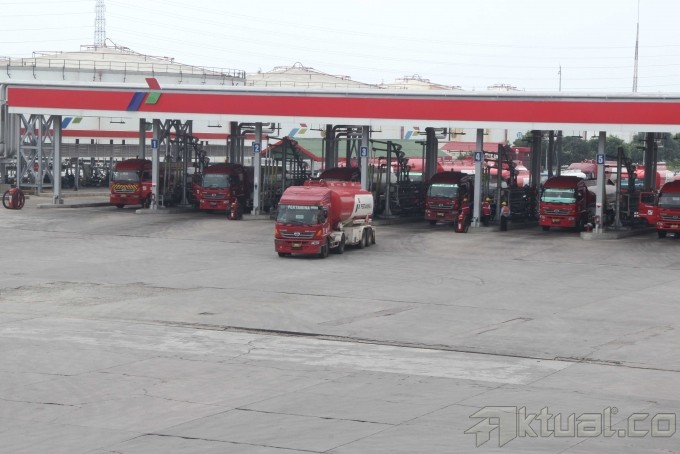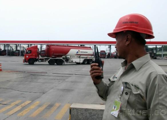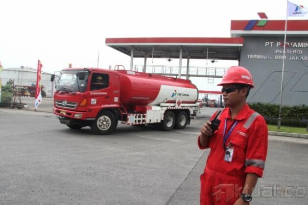 Pekerja PT Pertamina melakukan penjagaan di Terminal Bahan Bakar Minyak (BBM) Plumpang Pertamina, Jakarta Utara, Rabu (31/7). Estimasi pemakaian BBM dan LPG pada masa puasa dan Lebaran umumnya diperkirakan naik dengan basaran masing-masing, premium naik 14 persen dari rata-rata harian normal 80.926 KL menjadi 91.830 KL, Avtur naik 86 persen dari rata-rata harian normal 10.619 KL menjadi 11.536 KL dan LPG naik 6.6 persen dari rata-rata harian normal 17.612 MT menjadi 18.781 MT dan Solar turun 4.9 persen dari rata-rata harian normal 40.626 KL menjadi 38.628 KL. Aktual/Tino Oktaviano