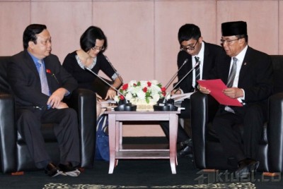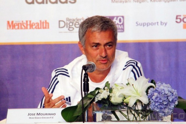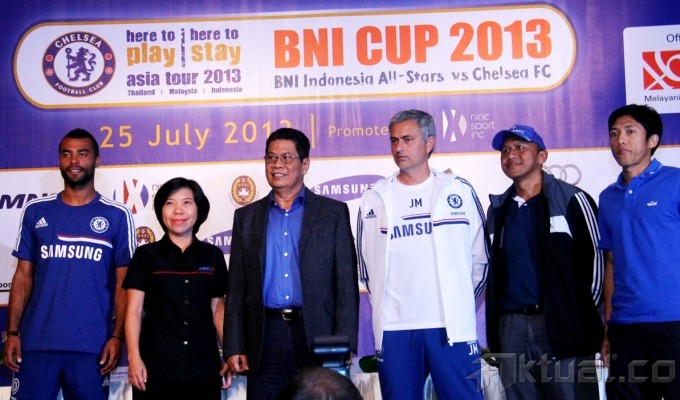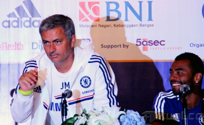 Manajer Chelsea Jose Mourinho bersama pemain Chelsea Ashley Cole memberikan keterangan kepada wartawan terkait kedatangannya ke Jakarta, Selasa (23/7).Dalam konferensi persnya Mourinho menyatakan jika kedatangan mereka ke Indonesia adalah untuk mengembangkan nama Chelsea untuk semakin besar lagi di dunia, dan memiliki fans diseluruh dunia. Ia juga berharap pada pertandingan Kamis nanti akan dikejutkan oleh penampilan para pemain Indonesia. Aktual/Oke Dwi Atmaja