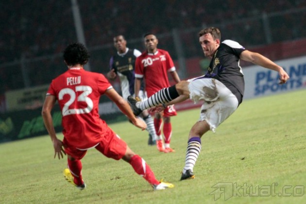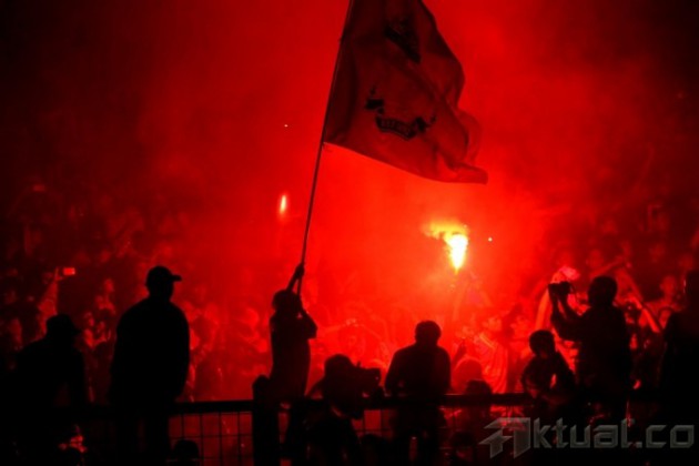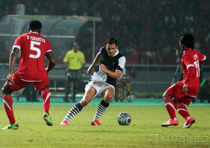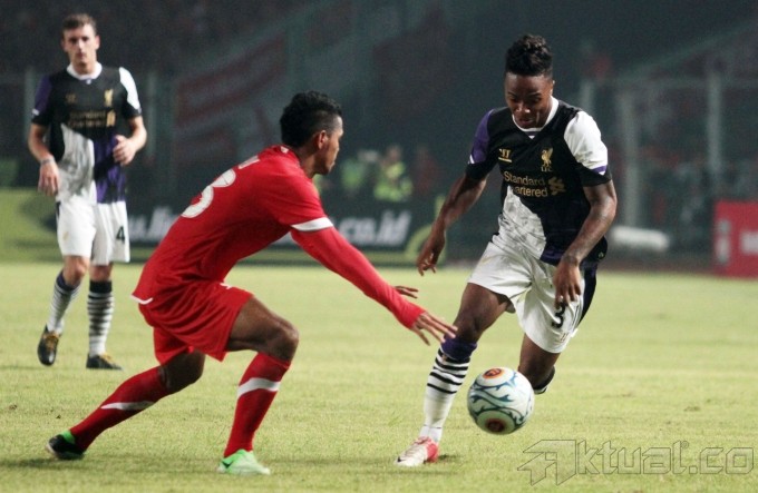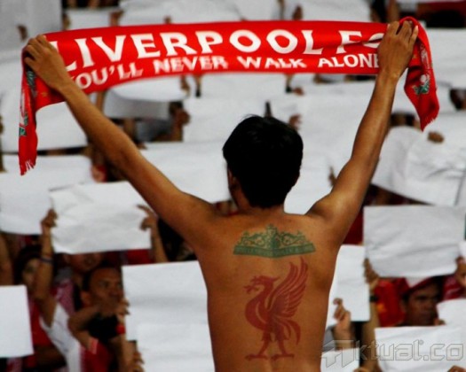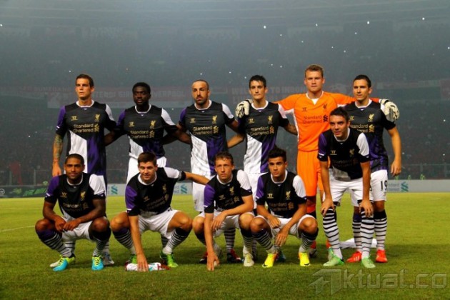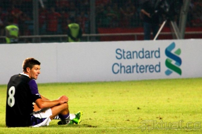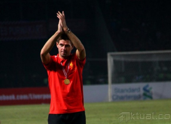 Kapten Liverpool FC, Steven Gerrard, memberikan applause kepada ribuan Liverpudlian Indonesia usai pertadingan Liverpool melawan Indonesia XI, dalam rangkaian tur pramusim Liverpool di Stadion Gelora Bung Karno, Senayan, Jakarta, Sabtu (20/7). Klub liga Inggris, Liverpool, menaklukkan tuan rumah Indonesia XI dengan skor 0-2. Aktual/Oke Dwi Atmaja