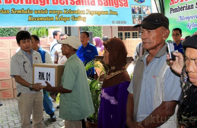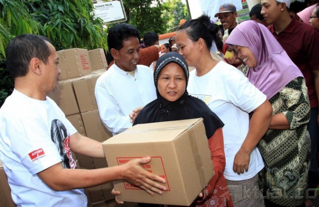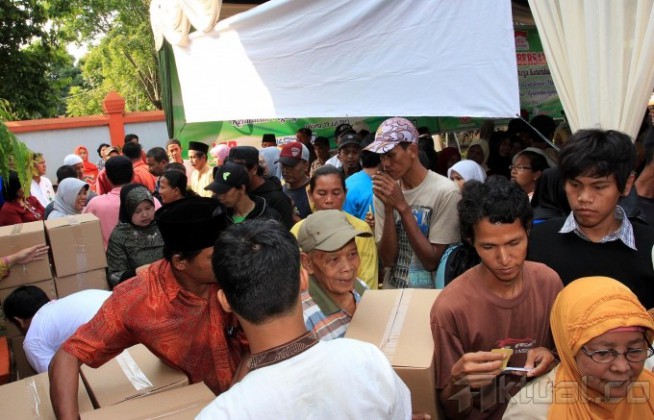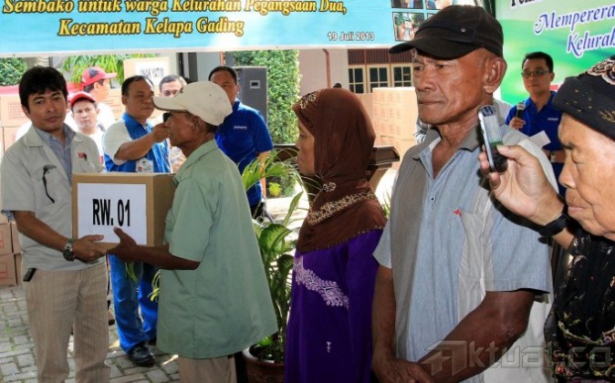 Sejumlah warga antre untuk mendapatkan sembako gratis yang diadakan Astra Otoparts di Kantor Kelurahan Pegangsaan Dua, Kelapa Gading, Jakarta Utara, Minggu (21/7). Program yang merupakan agenda rutin tahunan dari kegiatan Corporate Social Responbility Astra Otoparts sejak tahun 2002 ini membagikan paket sembako kepada 1.050 KK dalam rangka kepedulian dengan sesama, khususnya terhadap warga yang kurang mampu. Aktual/Tino Oktaviano
