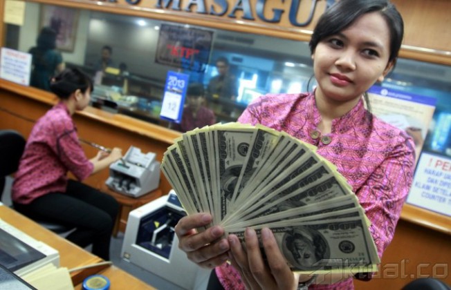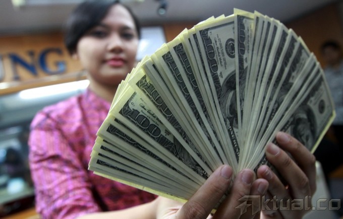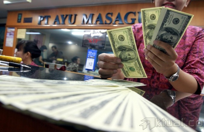 Seorang karyawan memperlihatkan mata uang dolar di tempat penukaran uang, Ayu Masagung, Kwitang, Jakarta Pusat, Selasa (16/7). Menko Perekonomian Hatta Rajasa memastikan pelemahan rupiah atas dolar AS yang terjadi bukan karena fundamental Indonesia yang tidak baik. Namun ini disebabkan situasi makro ekonomi dunia. Dolar masih perkasa di antara mata uang kawasan Asia lainnya. Data Jakarta Interbank Spot Dolar Rate (Jisdor) BI, posisi Rupiah berada pada Rp 10.036 per dolar AS. Aktual/Tino Oktaviano