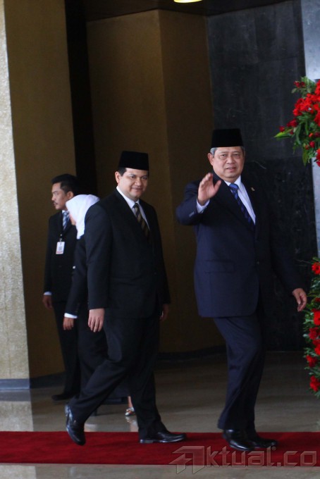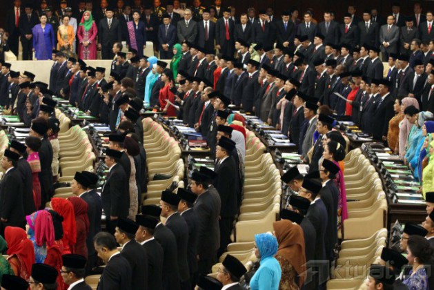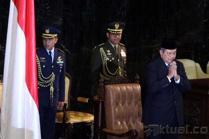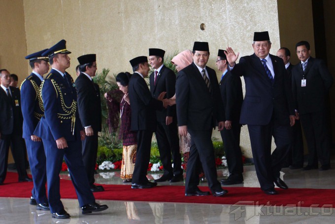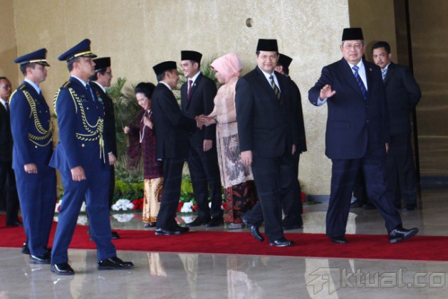 Presiden Soesilo Bambang Yudhoyono memberikan penghormatan saat mengahiri acara pelantikan anggota DPR/DPD/MPR, di Gedung Parlemen, Jakarta, Rabu (1/10/2014). Sebanyak 555 anggota DPR dan 130 anggota DPD dilantik sebagai wakil rakyat untuk periode 2014-2009 dan disaksikan oleh Presiden Soesilo Bambang Yudhoyono dan Wakil Pesiden Boediono serta Presiden terpilih dan Wakil Presiden Joko Widodo dan Jusuf Kalla. AKTUAL/TINO OKTAVIANO