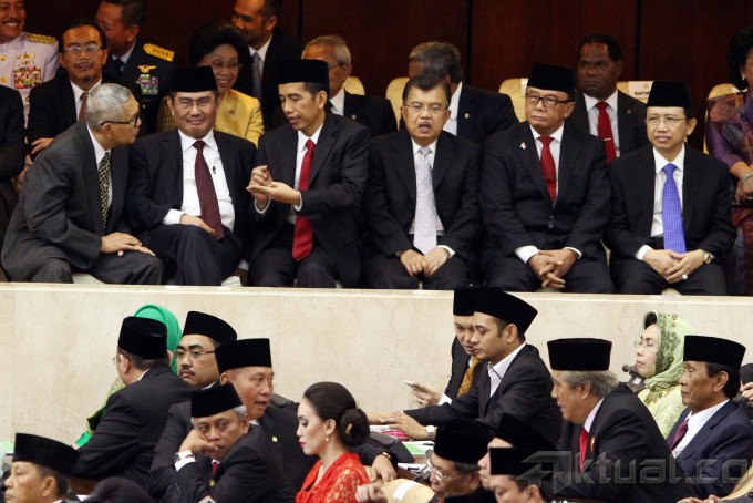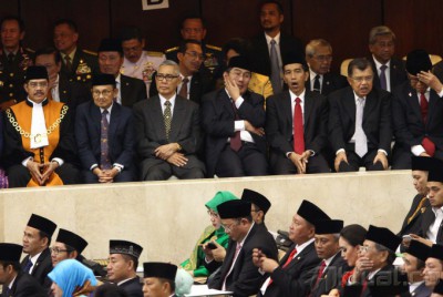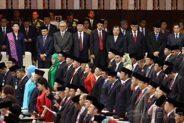 Presiden terpilih Joko Widodo (kelima dari kanan) Wakil Presiden terpilih Jusuf Kalla (keempat dari kanan) bersama sejumlah pejabat dan mantan pejabat hadir pada pelantikan anggota DPR/DPD/MPR, di Gedung Parlemen, Jakarta, Rabu (1/10/2014). Sebanyak 555 anggota DPR dan 130 anggota DPD dilantik sebagai wakil rakyat untuk periode 2014-2009. AKTUAL/TINO OKTAVIANO