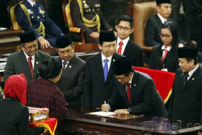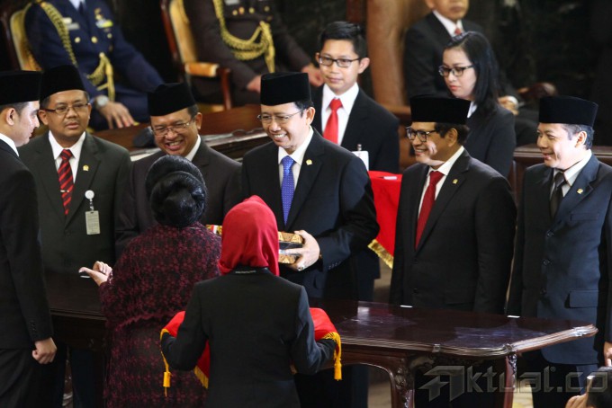 Ketua DPR Marzuki Alie (tengah) didampingi Wakil Ketua DPR (dari kiri) Sohibul Iamn, Priyo Budi Santoso, Pramono Anung dan Taufik Kurniawan saat penandatanganan penyerahan catatan kinerja dan Daftar Inventaris DPR periode lalu kepada Pimpinan DPR sementara Popong Otje Djundjunan (membekangi), pada Paripurna Pelantikan anggota DPR/DPD/MPR di Gedung Parlemen, Jakarta, Rabu (1/10/2014). Sebanyak 555 anggota DPR dan 130 anggota DPD dilantik sebagai wakil rakyat untuk periode 2014-2019. AKTUAL/TINO OKTAVIANO