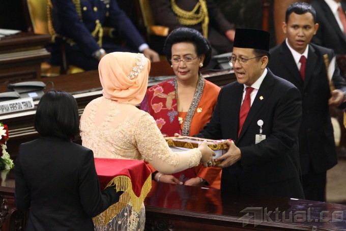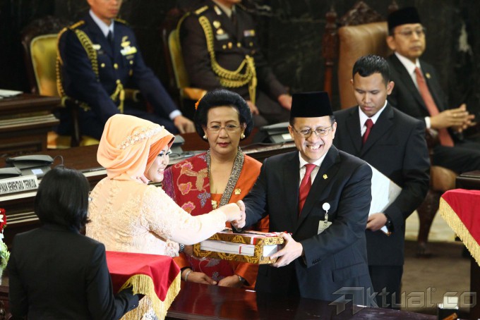 Ketua DPD Irman Gusman (kanan) didampinggi Wakil Ketua DPD GKR Hemas (tengah) menyerahkan catatan kinerja dan Daftar Inventaris DPD periode lalu kepada Pimpinan DPD sementara Riri Damayanti Jhon Latief (kiri), pada Paripurna Pelantikan anggota DPR/DPD/MPR di Gedung Parlemen, Jakarta, Rabu (1/10/2014). Sebanyak 130 anggota DPD 555 anggota DPR dilantik sebagai wakil rakyat untuk periode 2014-2019. AKTUAL/TINO OKTAVIANO
