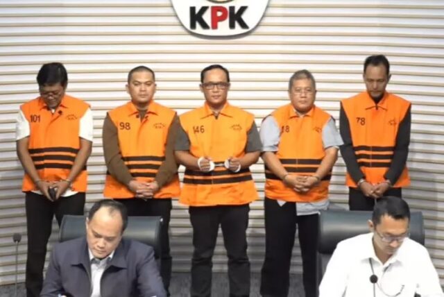 KPK menetapkan tersangka terhadap Bupati Lampung Tengah Ardito Wijaya, Riki Hendra Saputra selaku anggota DPRD Lampung Tengah, Ranu Hari Prasetyo selaku adik Bupati Lampung Tengah, Anton Wibowo selaku Plt. Kepala Badan Pendapatan Daerah Lampung Tengah sekaligus kerabat dekat Bupati, dan Mohamad Lukman Sjamsuri selaku pihak swasta atau Direktur PT Elkaka Mandiri, di Gedung KPK, Jakarta, Kamis (11/12/2025). Foto: Achmat/Aktual.com